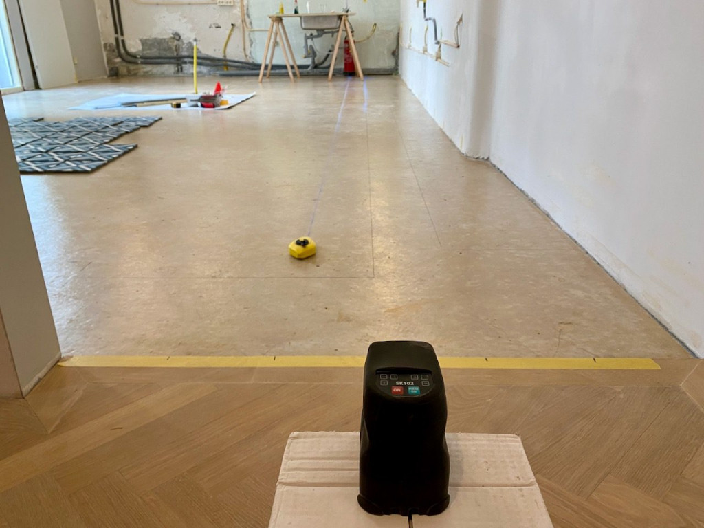 Met mijn laserapparaat straalde ik langs de tegels een lijn naar de overkant. Die lijn trok ik als het ware over met een speciaal touwtje waar krijt op zit. Zo tekende ik een paar parallele lijnen op de vloer.