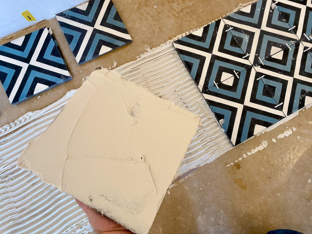 Ik had op het internet geleerd dat de meest veilige manier om een cementtegel te lijmen de zogenaamde “butter en flow” techniek is. Met een lijmkam breng je de lijm op de vloer aan, met een platte troffel smeer je ook de achterkant van de tegel in. Het is vast heel veilig, maar allemachtig wat neemt dat een hoop tijd in beslag.