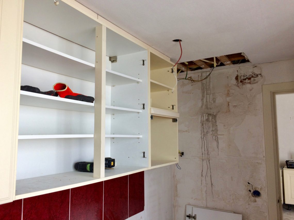 De eerste helft van het plafond is er al uit, morgen neem ik de rest onder handen, en pas dan kan ik een verantwoord plan voor alle toekomstige water- en elektraleidingen gaan maken. Ik heb een donkerbruin vermoeden dat ik een hoop kan gaan hergebruiken, maar daarover later meer.