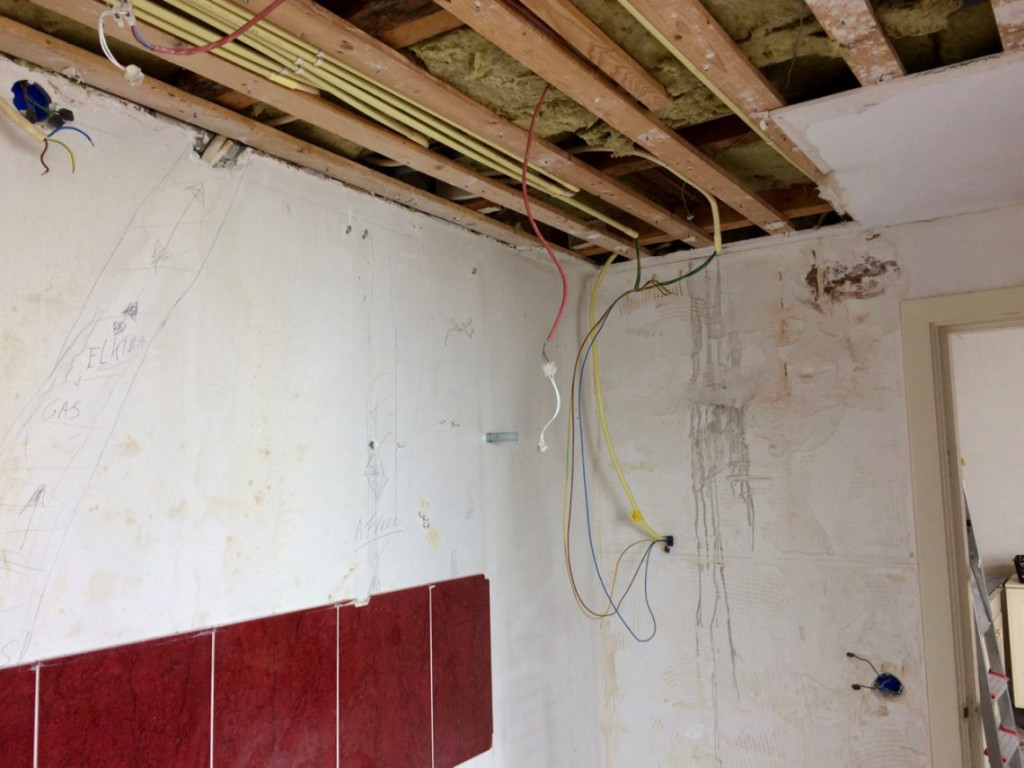Onze bijkeuken ligt onder onze badkamer, en beiden zijn aan elkaar geweven met een web van elektraleidingen Er komt natuurlijk ook heel wat stroom kijken bij het sfeervol uitlichten en op gang houden van een gigantisch bubbelbad. Eergisteren had ik al wat speurwerk aan de badkamervloer verricht, en ontdekt dat de basis van die vloer een stevige betonplaat is. Vandaag hoopte ik eenvoudig vanaf de plafondzijde te kunnen ontdekken hoe alle leidingen liepen. Eerst prutste ik nog wat met kleine kijkgaatjes, maar al snel besloot ik dat er slechts één juiste benadering is: Wegslopen die handel.