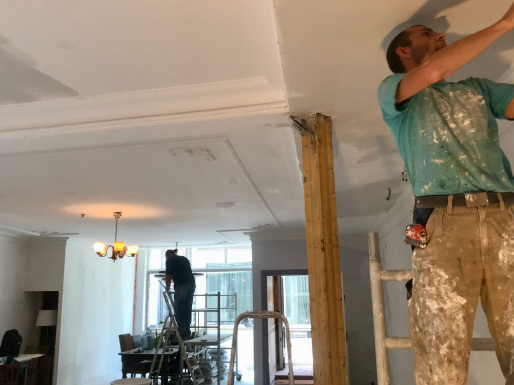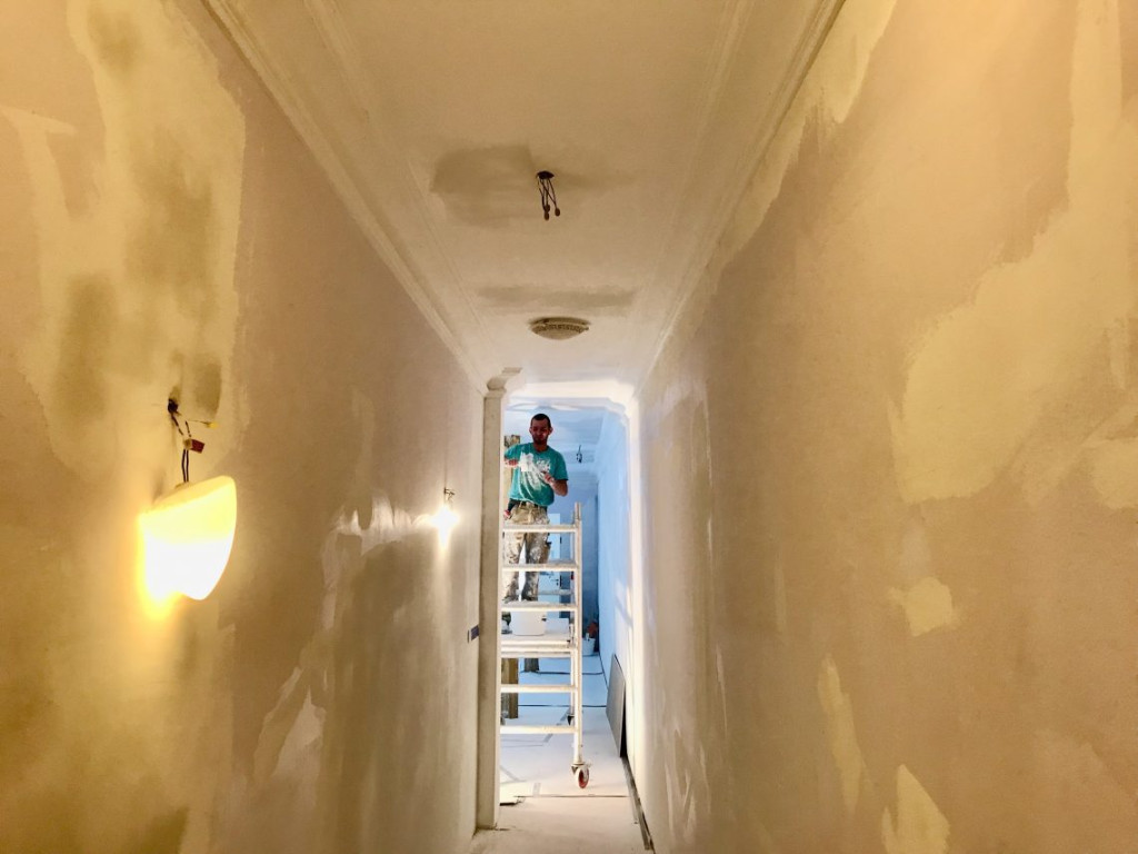 Daarna heeft Hessel een week ‘met zichzelf’ . Het is niet in woorden uit te drukken hoeveel zin hij daarin heeft. Even rustig in je eigen ritme, zonder troep, de puntjes op de plafond-i zetten. Aan het eind van die week komt Mariusz alles afdekken. Hij heeft een verfspuit, en spuit die vrijdag of zaterdag alle plafonds beneden wit. Dat is geweldig want die maandag daarop komt…. de houten vloer beneden. Heerlijk dus dat het plafond- verven al is gedaan voordat die vloer komt.