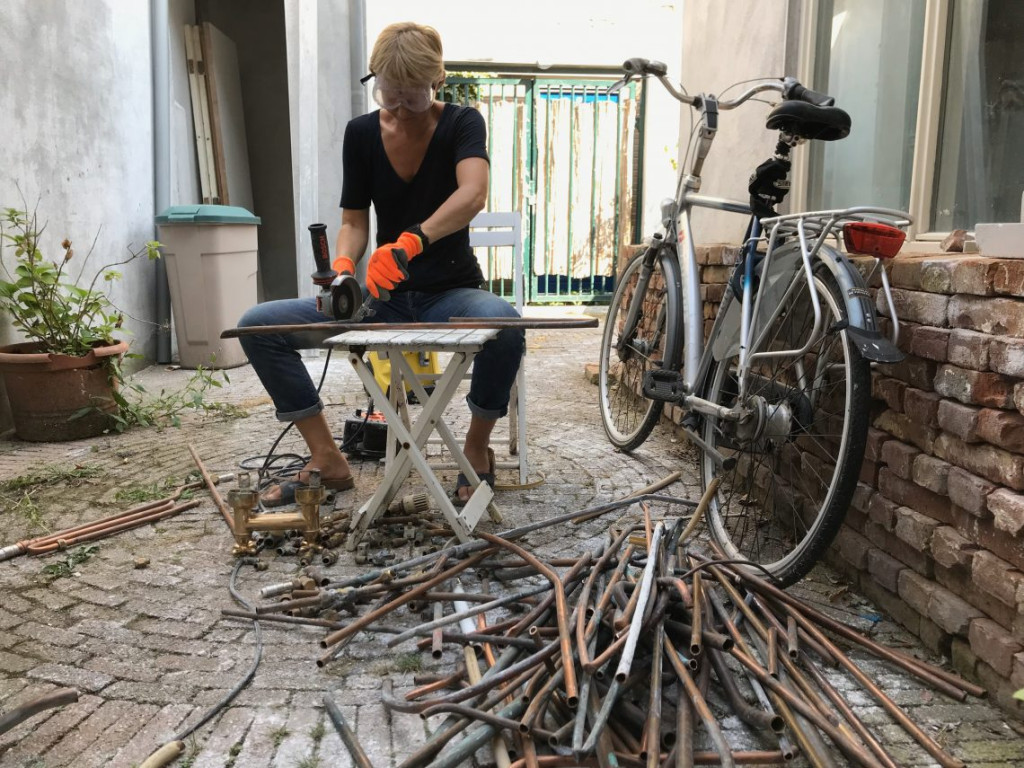 Ik deed ondertussen nog een stukje koper schoonmaken. Dat is: met een slijptol de koppelstukjes er af snijden. Dan brengt het meer op bij de ijzerboer..
