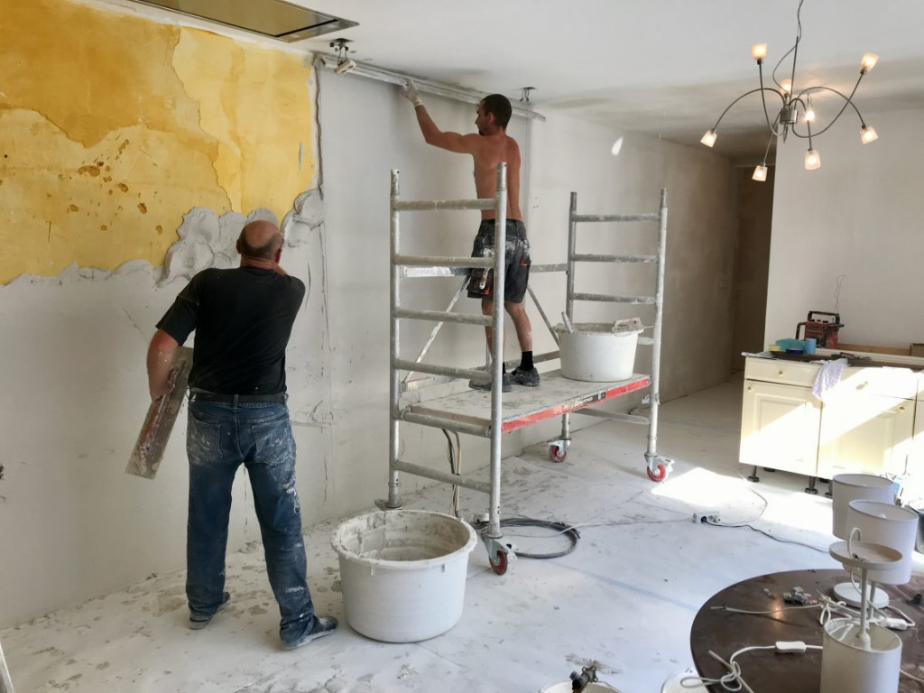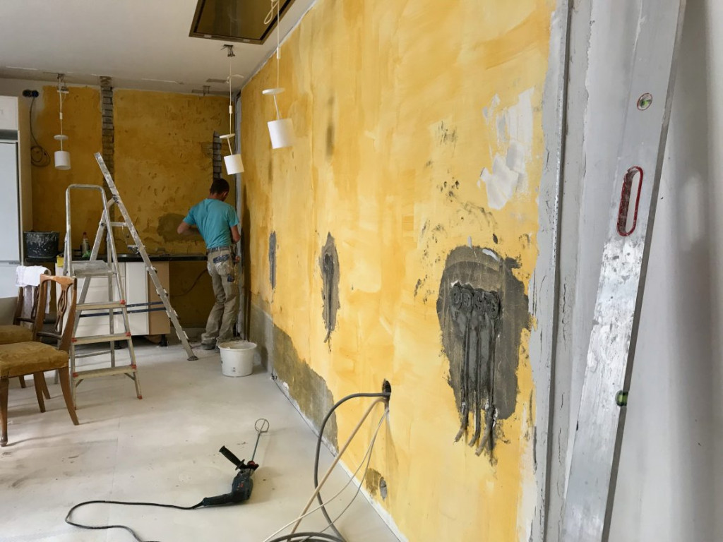 Omdat de Poolse vrienden zo hard gaan, moet Hessel ze ‘voor’ blijven. In de keuken bereid Hessel zelf de lange muur voor, zodat de mannen er met het plamuurmes langs kunnen.