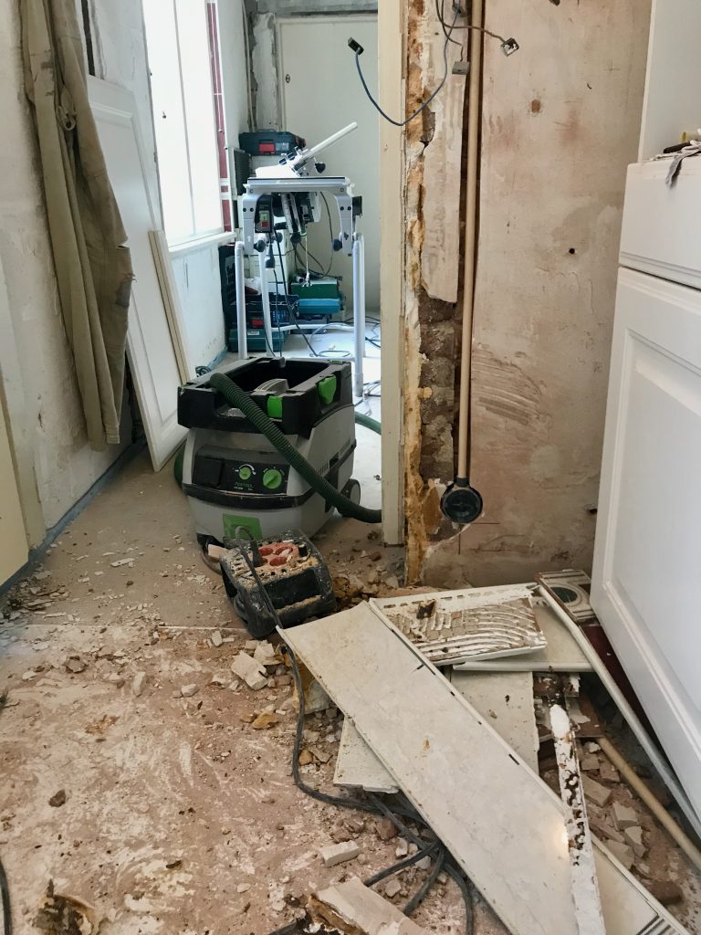 Deze foto is van de middag, einde dag was het al klaar. Hessel was bezig met Psamek om in de bijkeuken de deurpost er uit te halen en tikte tussendoor daar nog even de laatste rode tegels weg. Dat is de foto die bovenin het blog staat. Ik ruimde het puin op en de deurpost en Hessel zei in het voorbij gaan: dit is het laatste restant van het bordeel. Alles is nu weg. Het drong even niet echt tot me door. Als je zo in een werkflow zin, registreer je niet alles 100%. Toen ik in de gang de oude deurposten bij het vuil zette, kwam Hessel me tegemoet. Hij zei: weet je Annie, weet je wat er is: alle werkzaamheden voor mij op de parterre zijn gereed.