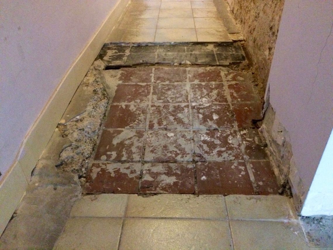Nadat ik de gangmuur had kaalgebikt, vond ik dat ik ook eens moest gaan onderzoeken waarom we zulke vreemde hobbels in de vloer van onze gang hadden. Ik was weken geleden al eens met het onderzoek begonnen, maar dat was maar half werk geweest. Vanaf de woonkamer is er een hoge schuine opgang de gang in. Na een meter komt er vervolgens een knik in de gangvloer, en vandaar loopt de gang horizontaal door naar achteren.
