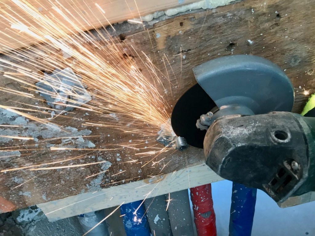 Eerst moesten er draadeinden weggeslepen worden. Met deze bouten zit de stalen balk die we alweer lang geleden aangebracht hadden bevestigd tegen de houten balk. Volgens mijn berekeningen zouden de overblijvende moeren precies weg kunnen vallen in de OSB plaat, en dan later afgedekt gaan worden door een gipsplaat.
