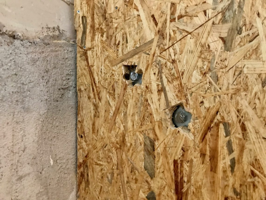Operatie OSB plaat ging van start. Vroeger werden al dat soort platen slechts in één maat geleverd: 122 x 244 centimeter. Gelukkig bestaat er tegenwoordig ook een “halve” maat, met rondom mes en groef. OSB is een bijelkaar geperst en gelijmd mengsel van houtsnippers. Niet stevig genoeg om op te lopen, maar meer dan stevig genoeg voor een muur als de onze. Het kost maar een fractie van de Underlayment platen die we op de slaapkamervloer gelegd hebben, en straks zien we er niks meer van vanwege de gipsplaat en stuclaag die er bovenop komen.