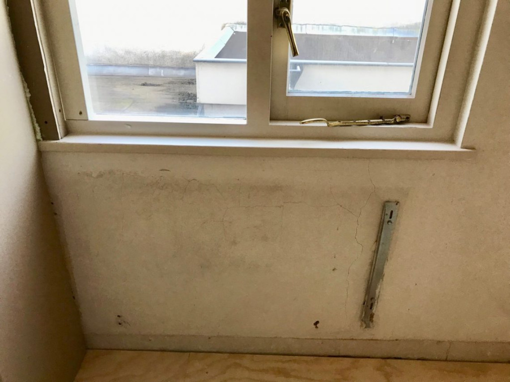 De houten balk links voor het raam is nu de nieuwe muur geworden. Het raam ziet er inmiddels echt uit alsof het altijd al zo smal geweest is.