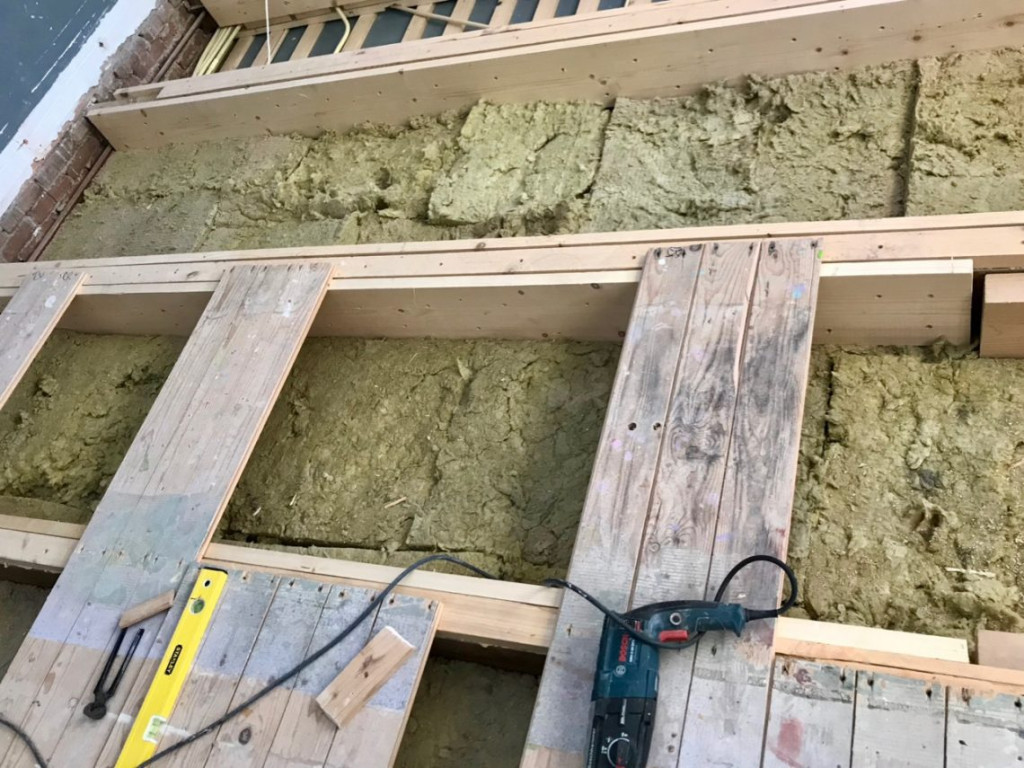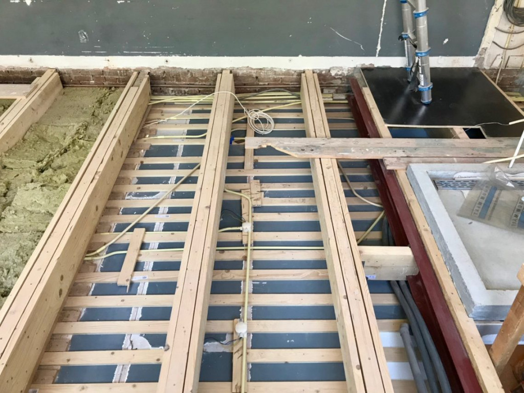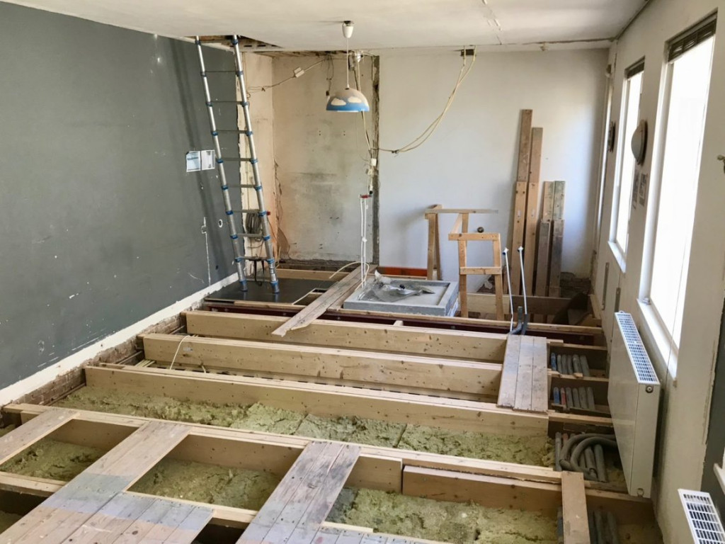 Het was leuk om ons nieuwe plafond van boven te bekijken. De stuclaag van de vorige bewoners is duidelijk te zien. Het lijkt allemaal sprekend op foto’s van maaaaaaaanden geleden, toen het plafond nog een golfslagbad met electra puzzel was. Maar nu is alles helemaal nieuw, horizontaal en klaar om afgedekt te gaan worden.