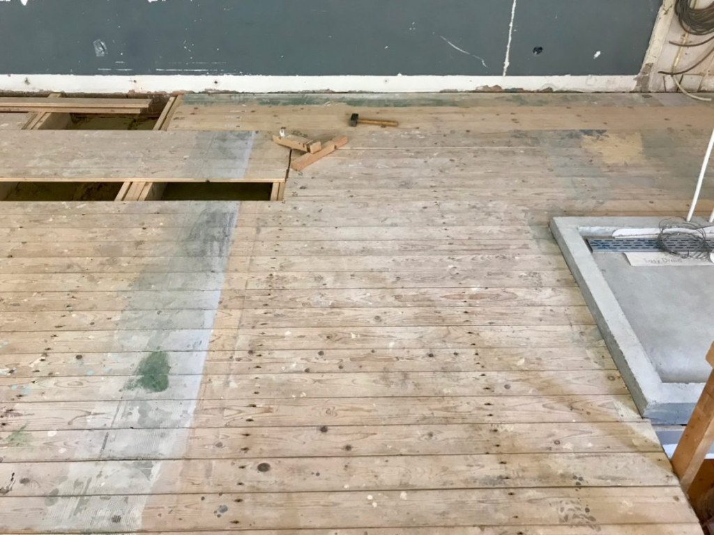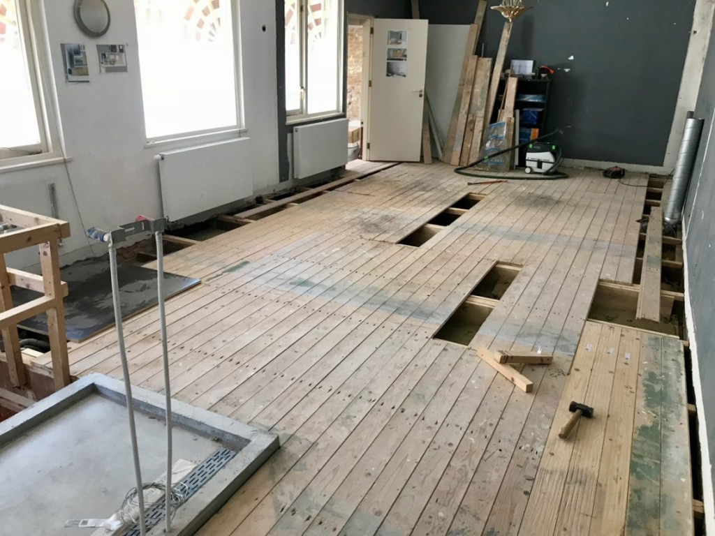 Alle planken liggen nu nog los, er ontbreken nog een paar nieuwe planken, maar dat weerhield me er niet van om aan het eind van de dag eens flink te gaan dansen op de nieuwe vloer. Hij bewoog nergens, hij boog nergens door, het is echt een supervloer geworden.