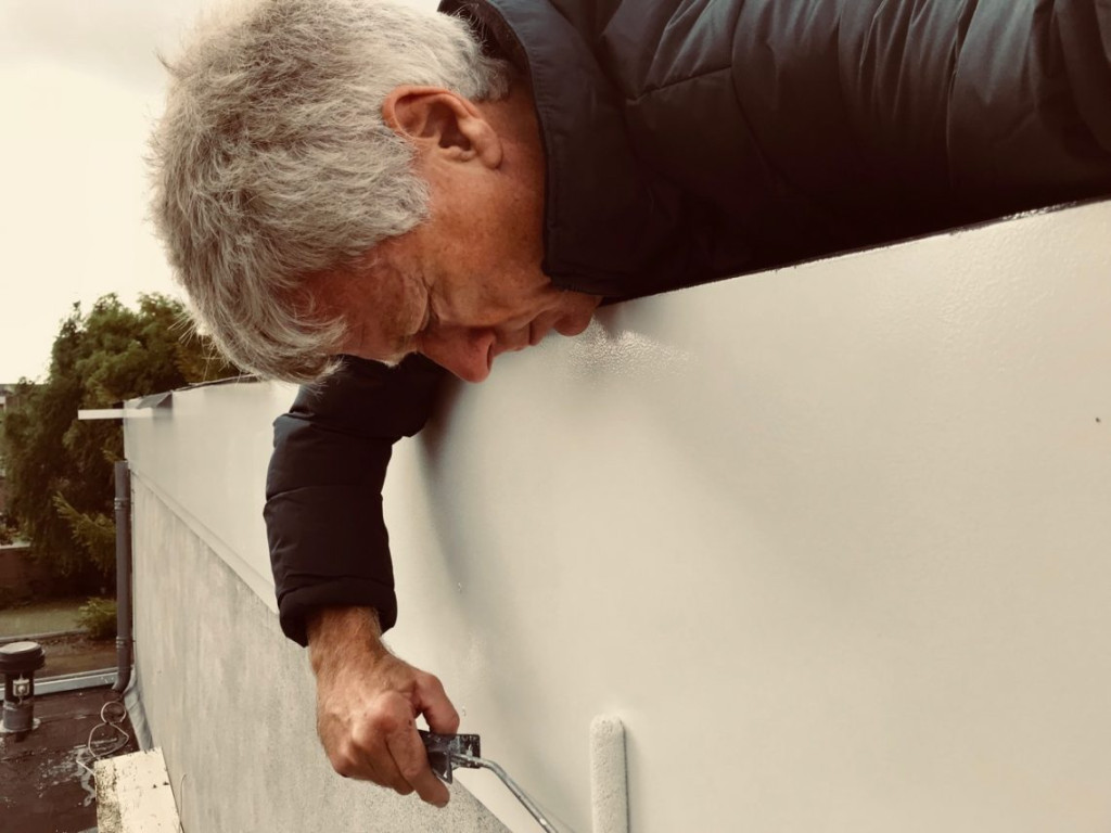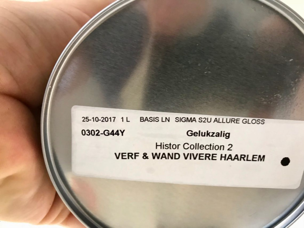 De boeidelen staan inmiddels strak in de verf. Ik had een licht gebroken wit uitgekozen, warm, maar niet te geel. Toen ik klaar was met schilderen, en nadat ik helemaal tevreden een inspectierondje om ons huis had gemaakt, zag ik onder op het blik dat de verf ook een naam had. “Gelukzalig”. Wat een dag!