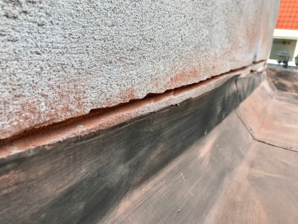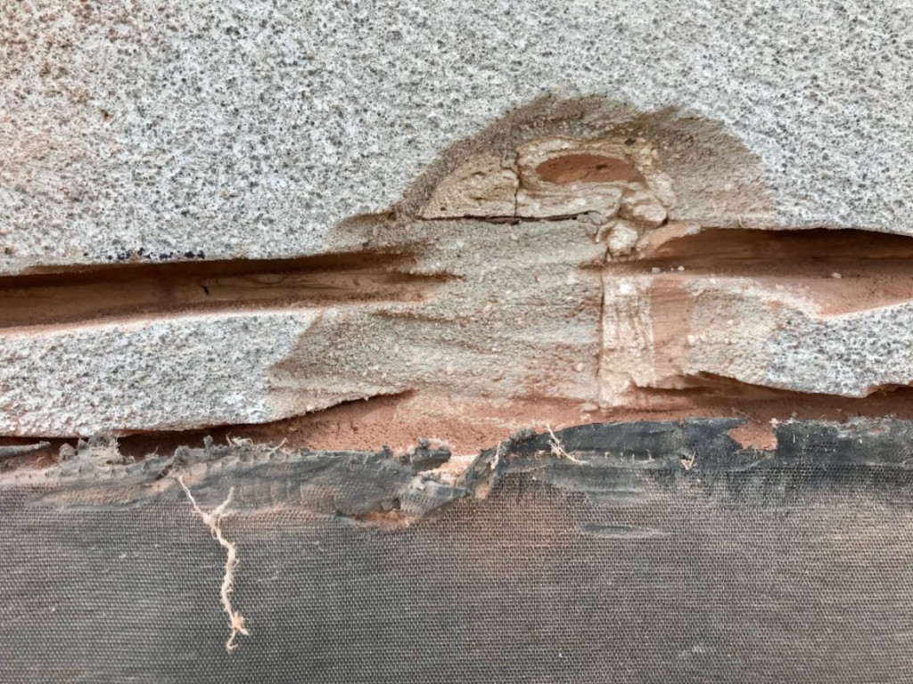 Toen de verf een beetje gedroogd was, heb ik de slijptol gepakt. Er moesten aan de wand met de buren nog loodslabben ingeslepen worden. De wand is helemaal afgestucd, dus ik ben eerst al slijpend op zoek gegaan naar bestaande voegen in het metselwerk.