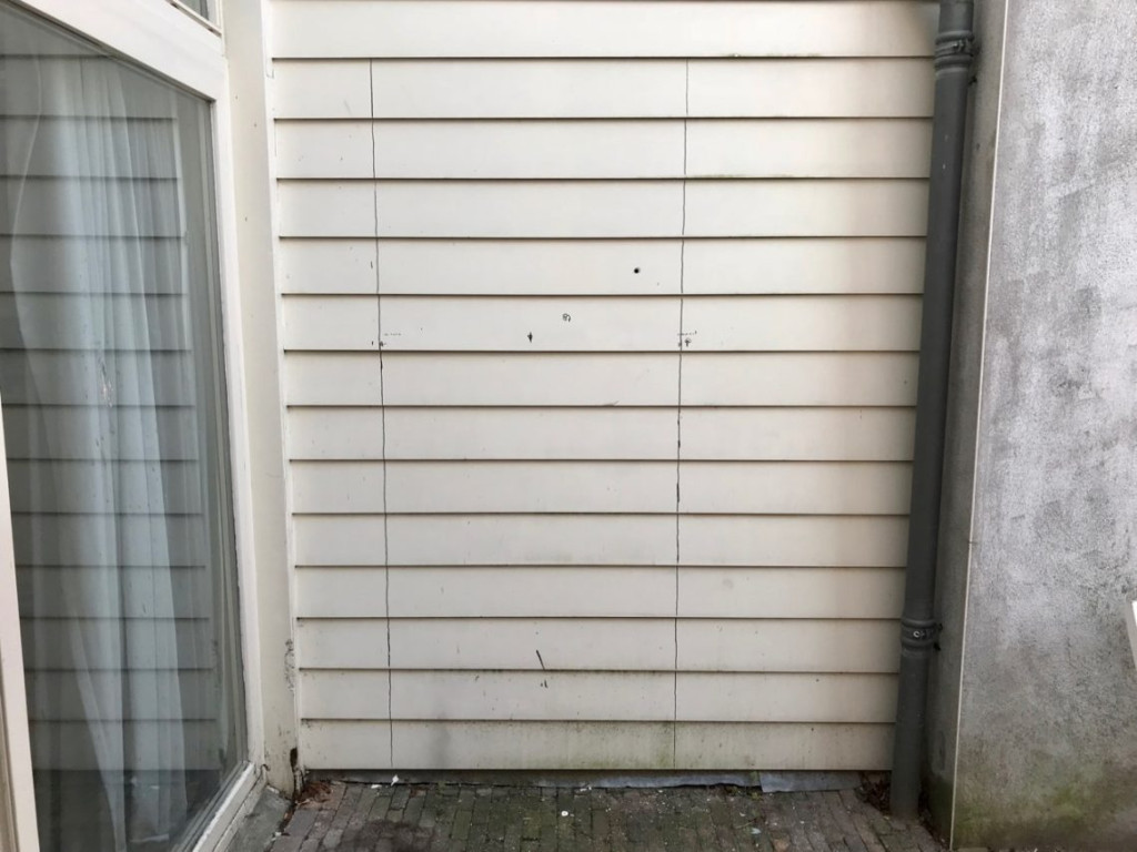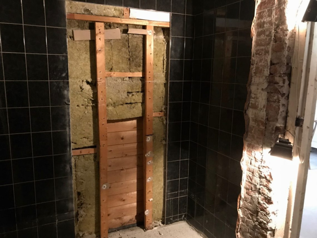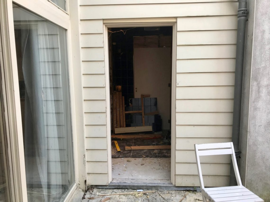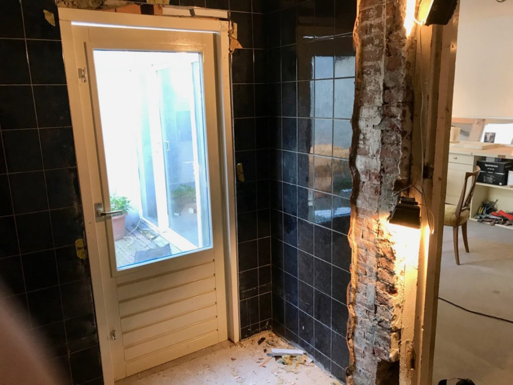 Niks geen lelijk hakwerk, nee, ik kon exact tussen de voegen doorzagen. De reciprozaag mocht weer eens uit zijn kist. Achter de tegels zat gipsplaat, daarachter rockwool, dan een laag schrootjes en helemaal buiten zaten Trespa planken tegen het geraamte geschroefd. Eerst heb ik de tegels en gipsplaten weggezaagd.