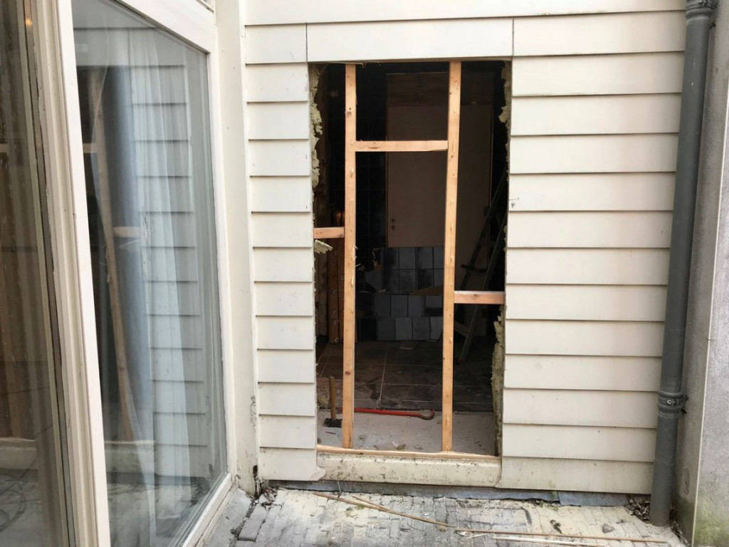 Ik had eerder op de ochtend het kozijn al op maat gemaakt en verlijmd, dat kon van binnenuit in het gat gestoken worden.
