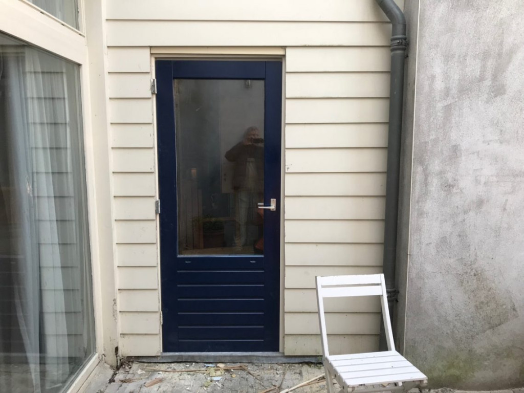 Morgen ga ik verder. Het kozijn staat nog los en de deur moet nog vastgemaakt worden, maar het ziet er toch al heel echt uit. Zelfs vanaf de keuken is het een grote verbetering. Ons binnenplaatsje had de allure van een gevangenis luchtplaats, maar nu de linkermuur een gezellige deur heeft, wordt de hele tuin meteen een stuk liefelijker. Denk de blauwe deur even in het wit, want dat gaat hij later worden.