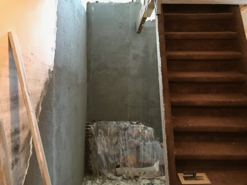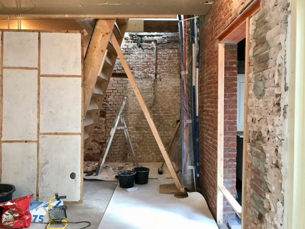 Om te beginnen werd onze trap als een soort ophaalbrug van de muur getakeld en daarna ondersteund. We moesten immers de hele muur kunnen stucen, ook onder de trap.