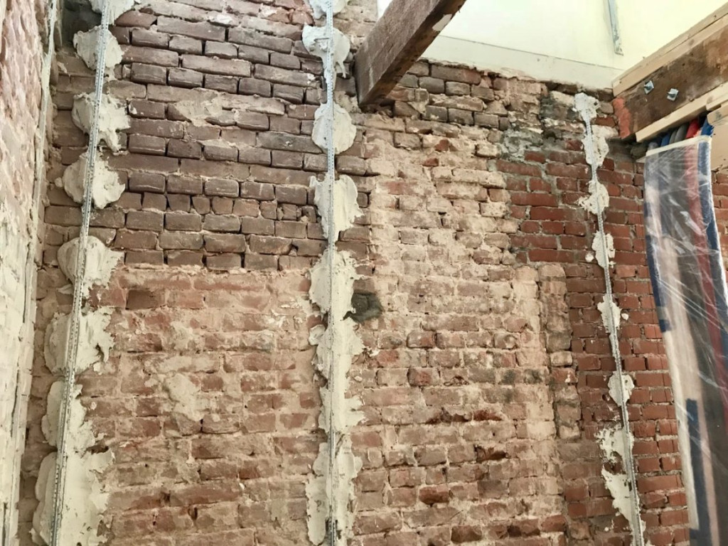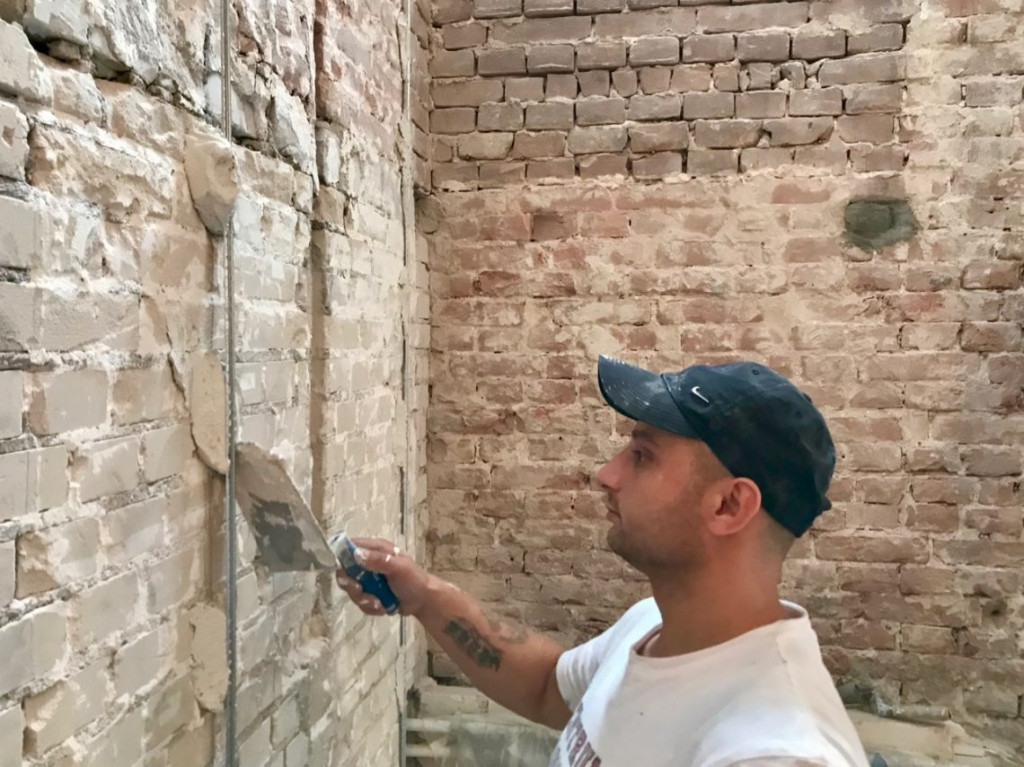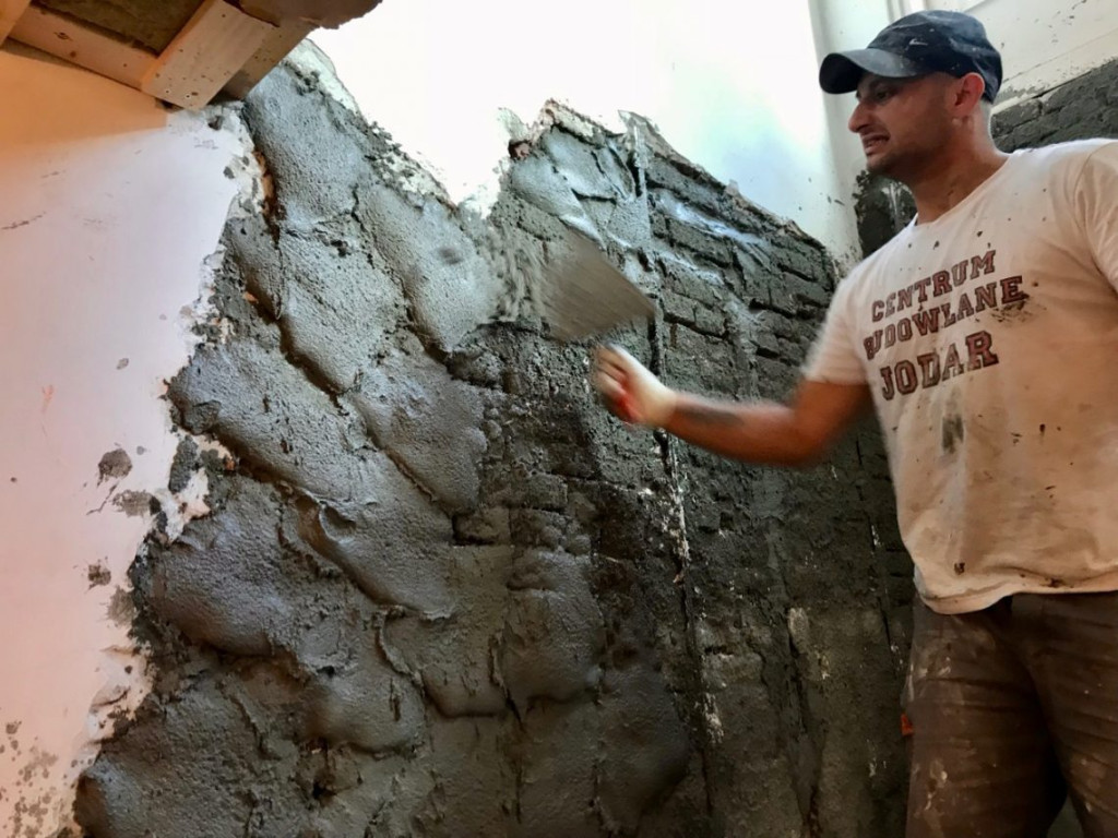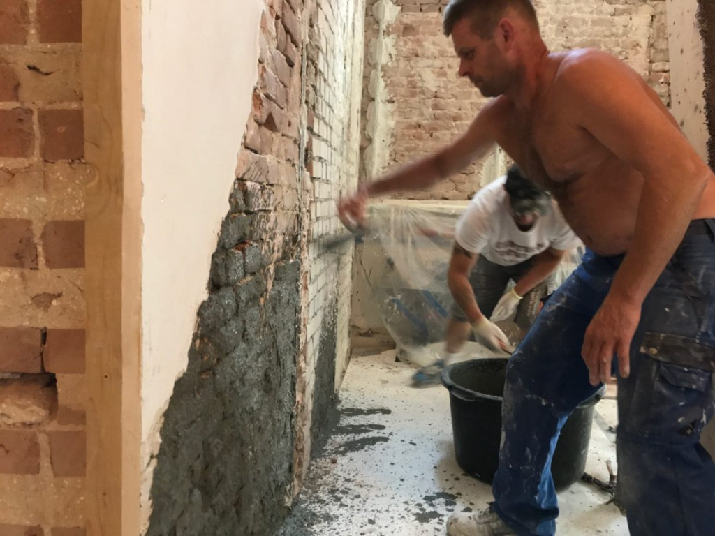 Marcin was al serieus bezig geweest met het plaatsen van de metalen strips, maar ging nu op volle krachten los. Er werd een “aanbrandlaag” aangebracht. Een pap-dun mengsel van water met wat kalkmortel en flink veel cement. In een razend tempo smeet hij het tegen de muur, Zbisjek kon hem haast niet bijhouden.
