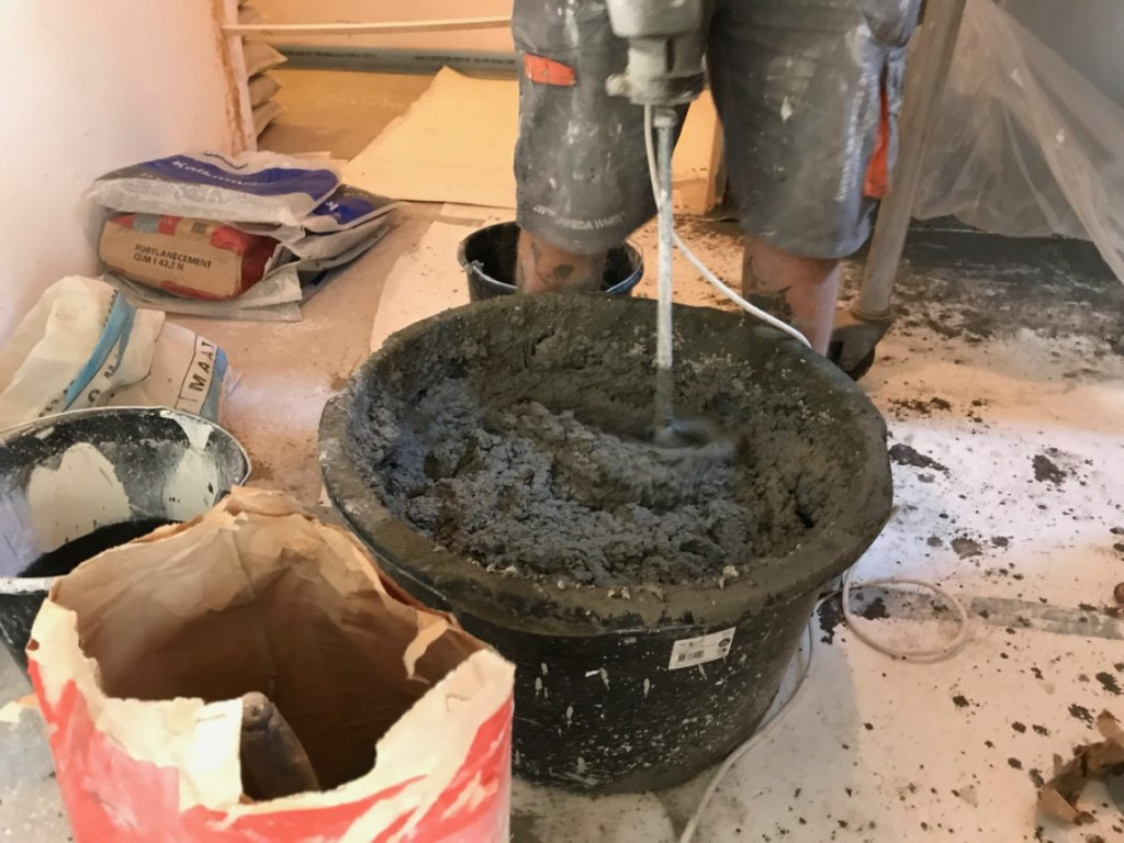 Tijd voor de eerste trog met mortel. Twee zakken kant en klare kalkmortel, gemengd met zes flinke scheppen cement.
