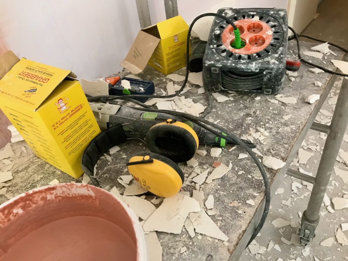 Toen de voorkant van de woonkamer af was, verplaatste ik de gipsstudio naar de wand waar straks het bloemenbehang komt, de wand met de pilaren.