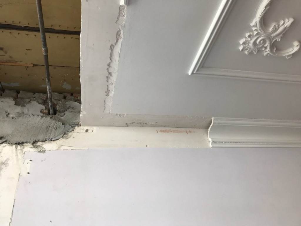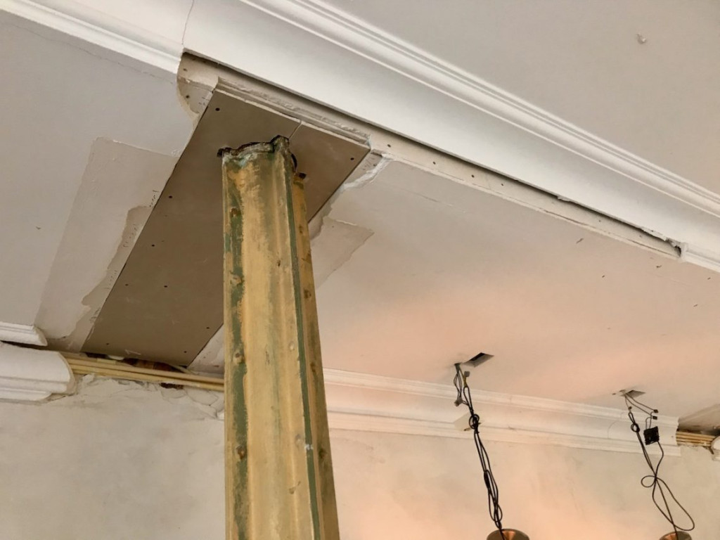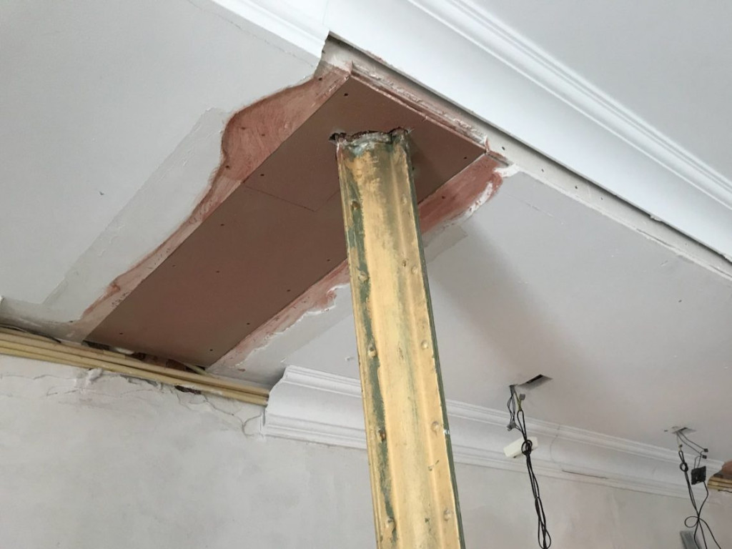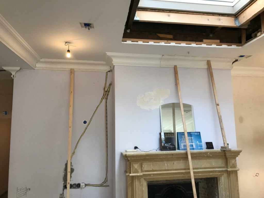 De vorige bewoners hadden rondom de zuilen een kleedkamer getimmerd. Door de kleedkamermuren waren de ornamenten ruw onderbroken geweest. Het plafond ontbrak eveneens. Door dit gat had ik de afgelopen maanden de elektra kunnen reconstrueren, maar nu moest het allemaal weer netjes dicht.