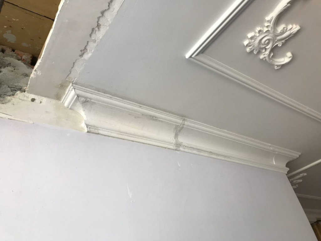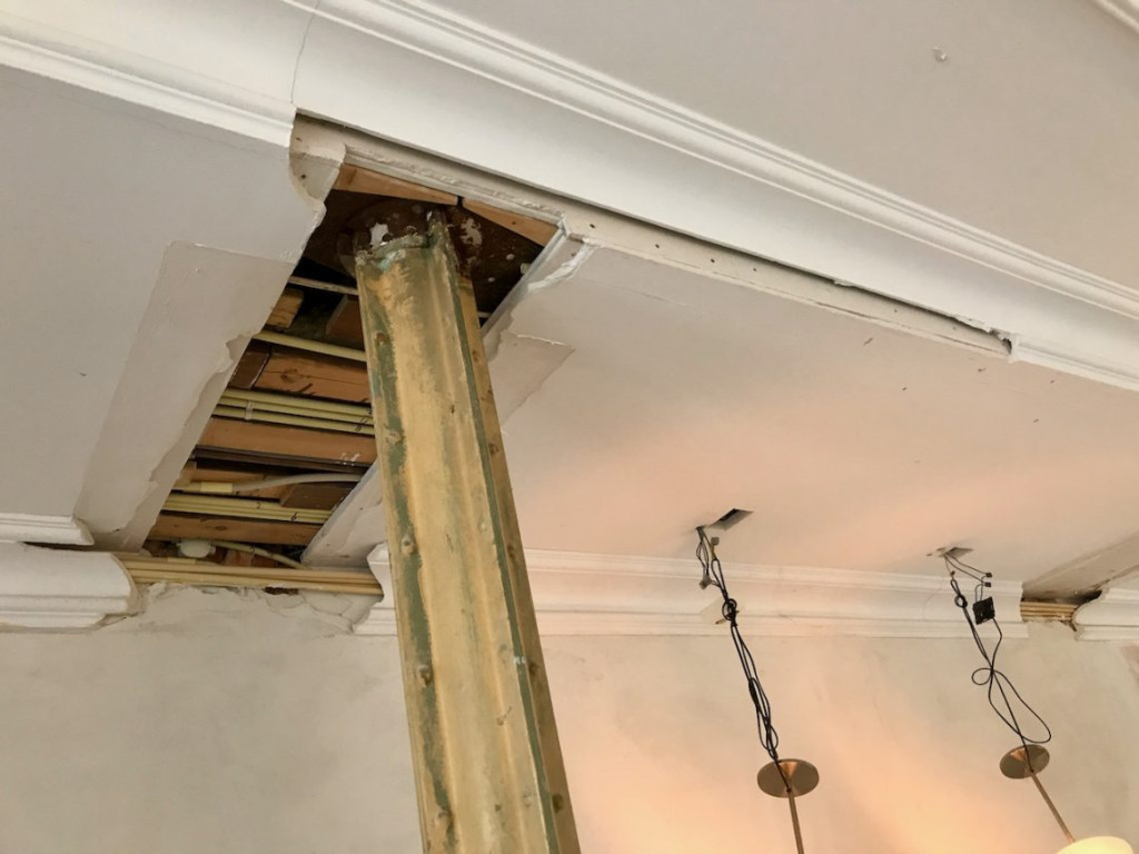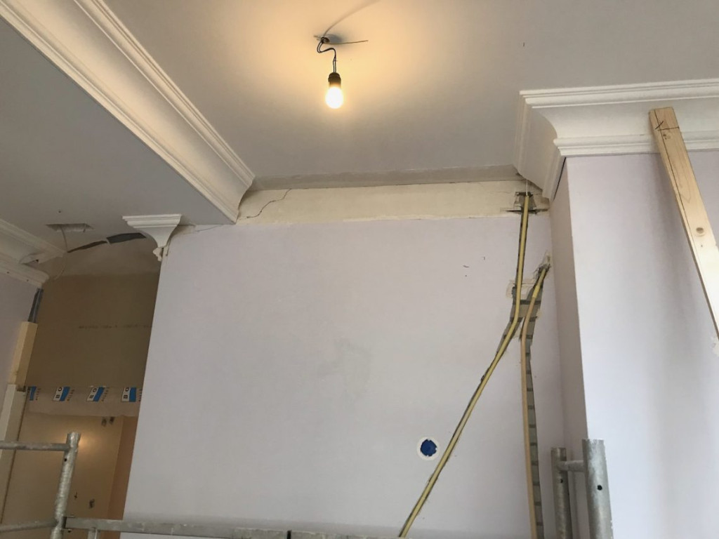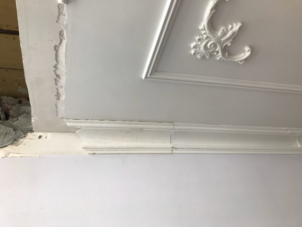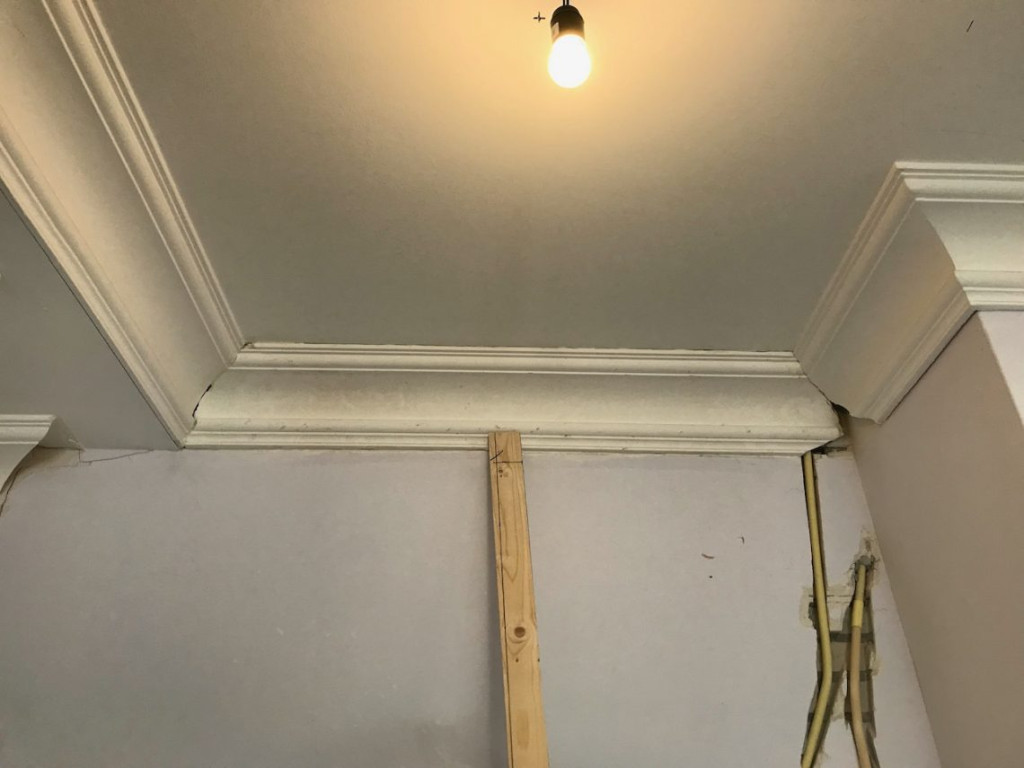 De vorige bewoners hadden rondom de zuilen een kleedkamer getimmerd. Door de kleedkamermuren waren de ornamenten ruw onderbroken geweest. Het plafond ontbrak eveneens. Door dit gat had ik de afgelopen maanden de elektra kunnen reconstrueren, maar nu moest het allemaal weer netjes dicht.