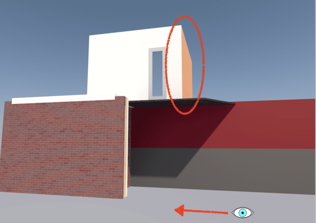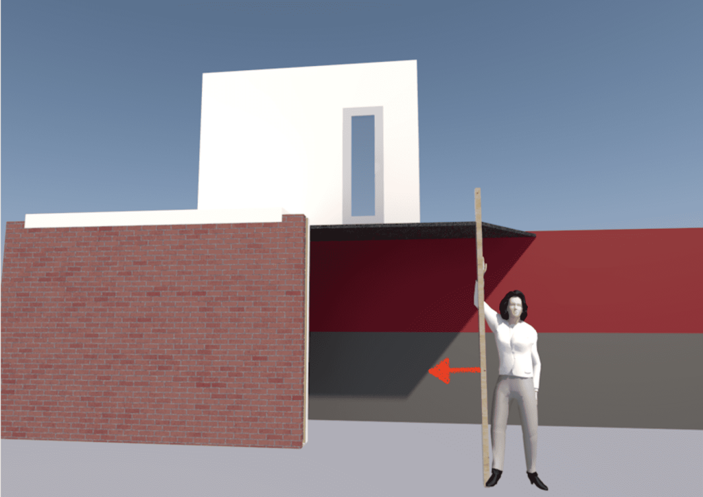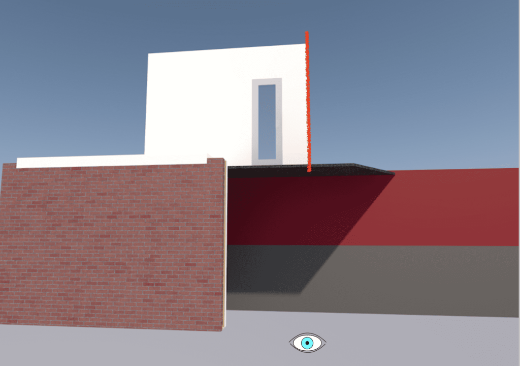 (PS, hier is Hessel even voor de uitleg. Het oranje vlak op het eerste plaatje is de zijmuur van ons bovenhuis. Tevens de kadastrale grens. In het verlengde van die muur komt de toekomstige schutting tussen onze twee tuinen te staan. En op die lijn gaan we ook de muur tussen het theater en ons eigen huis bouwen. Op plaatje 1 liep ik zover naar links, totdat ik precies paralel aan de bovenmuur keek.