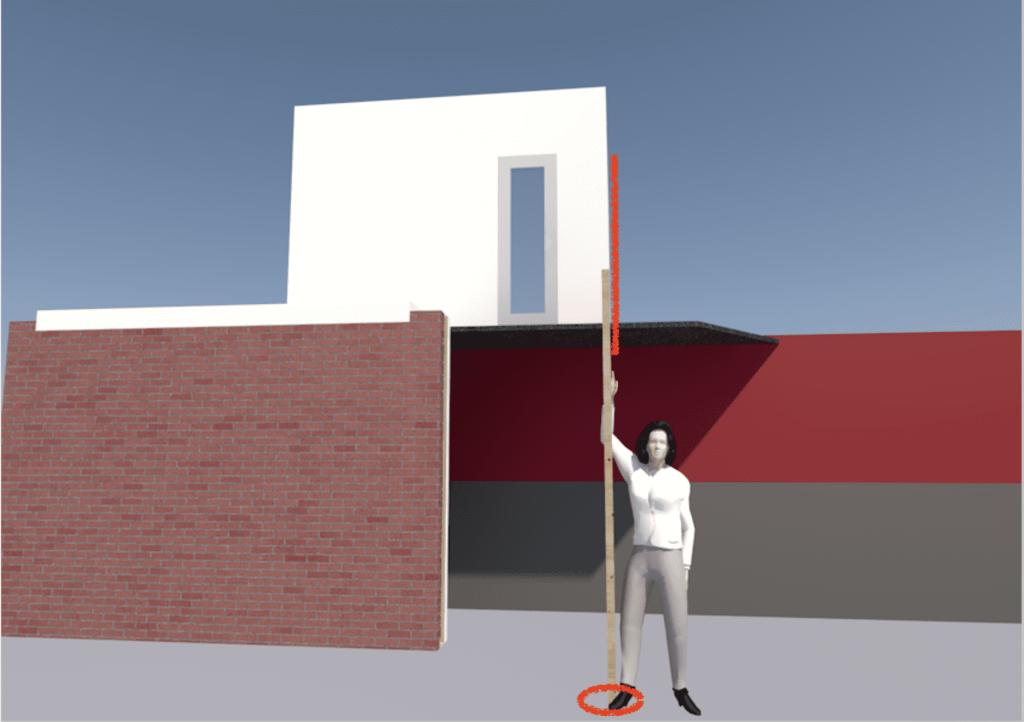 Natuurlijk hielp ik ook Hessel nog even met inmeten vanmorgen. Hij wilde namelijk exact nauwkeurig weten waar de tuin van de buren komt. Die moet ‘uitlijnen’ met onze buitenmuur. Om dat te bepalen moet je zeer goed kijken. Hieronder de schematische weergave: