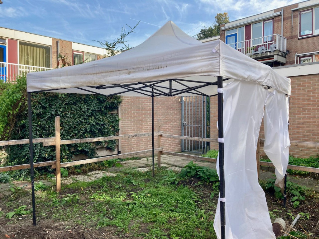 Tussendoor klapten we de schoongemaakte tent samen helemaal in. Eigenlijk verbazingwekkend hoe goed zo’n tent van een Alibaba achtige makelij zich heeft gehouden. Hij is toch helemaal puntgaaf, dus we bewaren ‘m voor een eventueel tuinfeestje deze zomer.