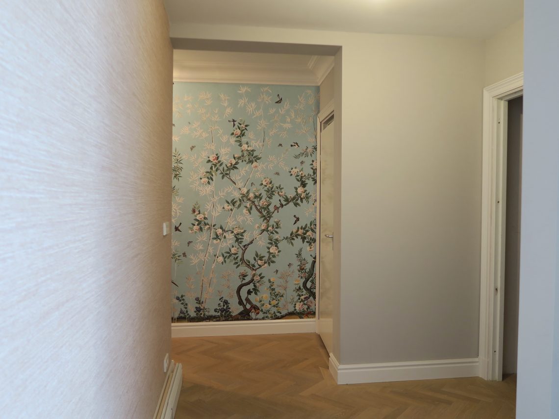 Nu, na onze verhuizing, ziet de hal er al een stuk beter uit. Maar hij is nog lang niet af. Hij krijgt nog een nieuwe vloer, de buitendeur wordt nog geschilderd, er komt een andere woonkamerdeur in en binnenkort wordt eindelijk de museale tegelwand gerestaureerd.