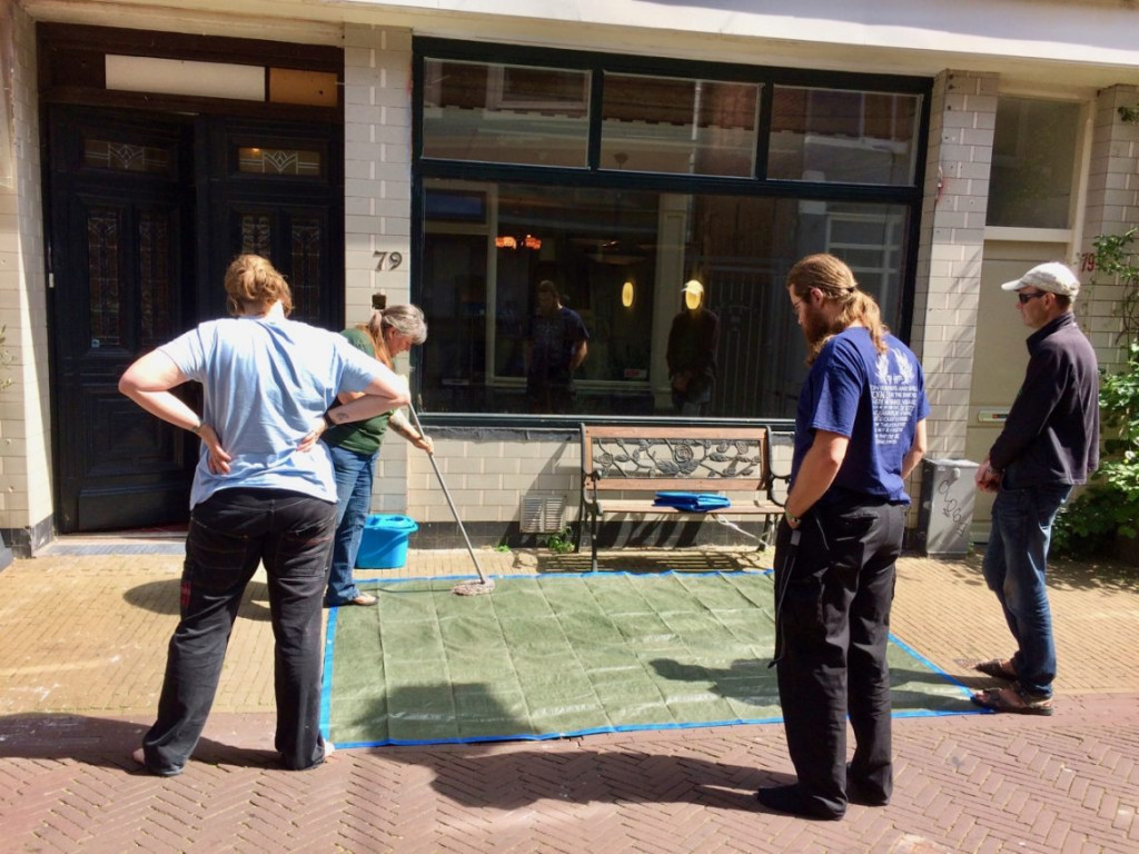 Toen ik helemaal representatief gekleed in mijn zo goed als nieuwe overall naar huis toe liep, werd ik vanaf een steiger vrolijk toegeroepen. Het was de straatklusjesman, die de blauwe gevel van de hashcoffeeshop  knalblauw aan het schilderen was.