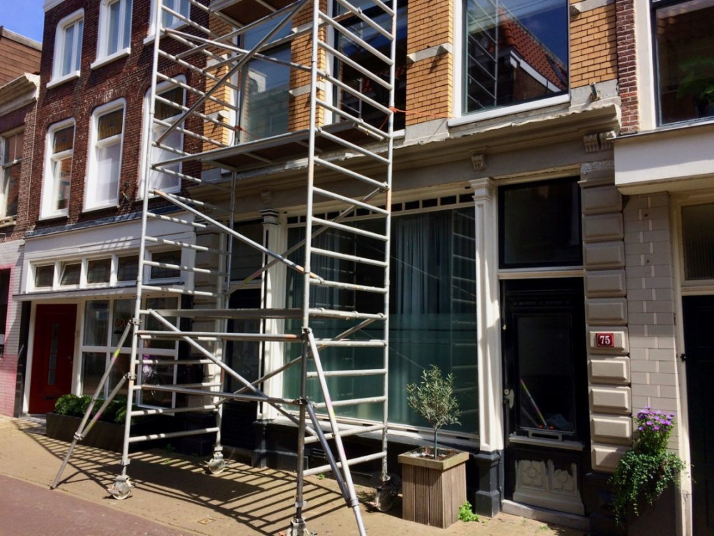 Weer twee panden verder stond een enorme steiger. “Vergunning, daar doen we niet aan”, vertelde de eigenaar van dat pand me. Gewoon een steiger neerzetten, en de kozijnen gaan schilderen. Lekker fris!