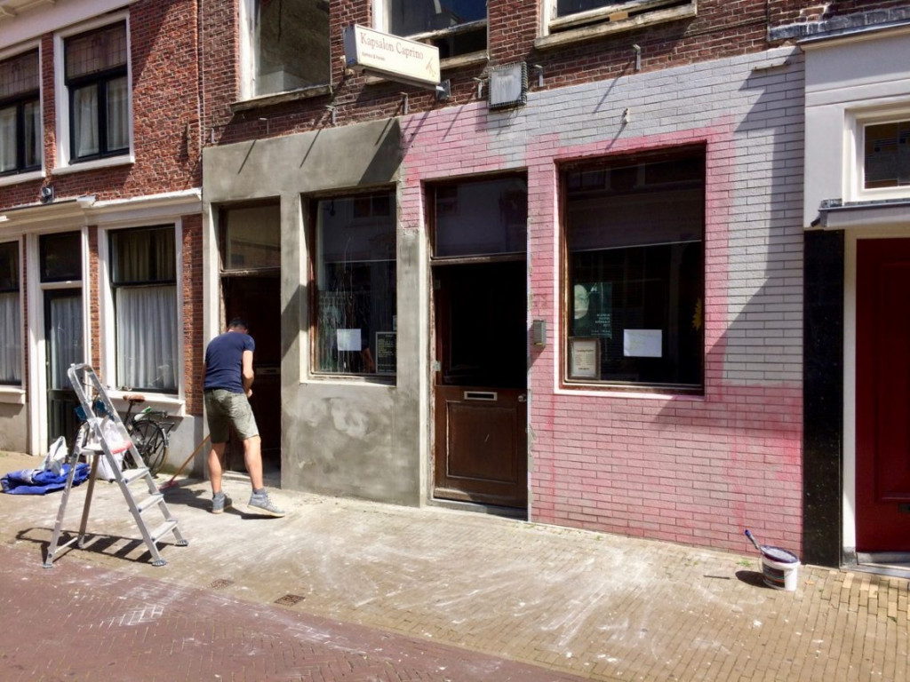 Even verderop was een enorme transformatie aan de gang. De kapperszaak waar Annekes vader en ikzelf trouwe klant zijn, werd van een nieuwe gevel voorzien. Voorheen was de gevel een spuuglelijke witte tegelwand, eigenlijk net zoals onze eigen gevel. Nu de gemeente vakantie heeft, en Haarlem dus geen inspecteurs van bouw en woningtoezicht op de fiets heeft zitten, was het een goed moment om de hele gevel razendsnel glad te stucen, zo vertelde de eigenaar van het pand me.