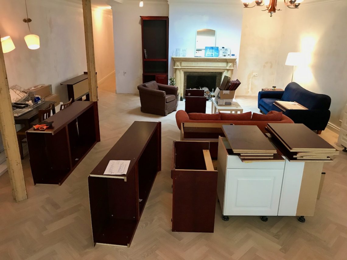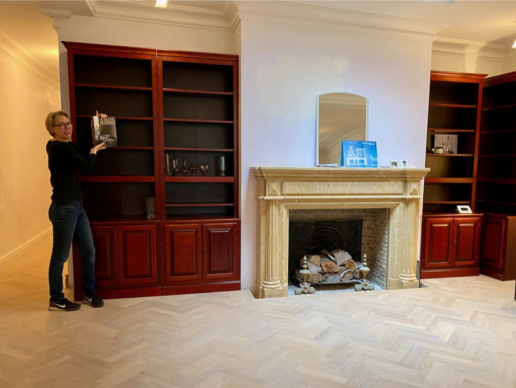 De ene kant is kleiner dan de andere kant, vandaar dat een kast overdwars staat. Wij vinden de vorm van de kasten heel mooi. Idealiter waren ze iets hoger geweest. De kleur kan er ook goed mee door. Stock heeft ze eigenlijk blauw bedacht -wat ik ook mooier vind omdat het dan veel moderner oogt- maar Hessel vind opeens het zo zonde om zulk mooi kersenhout over te schilderen. Nou, ja we zien nog wel wat we er mee doen: in ieder geval staat het heel tof en passen onze spullen er in als we gaan verhuizen. Heerlijk dus!
