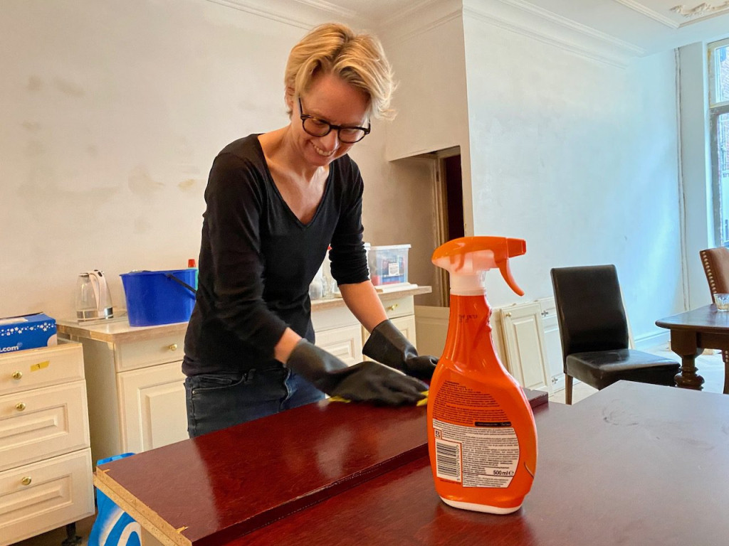 Terwijl Hessel de kasten hier en daar repareerde, maakte ik ze schoon.