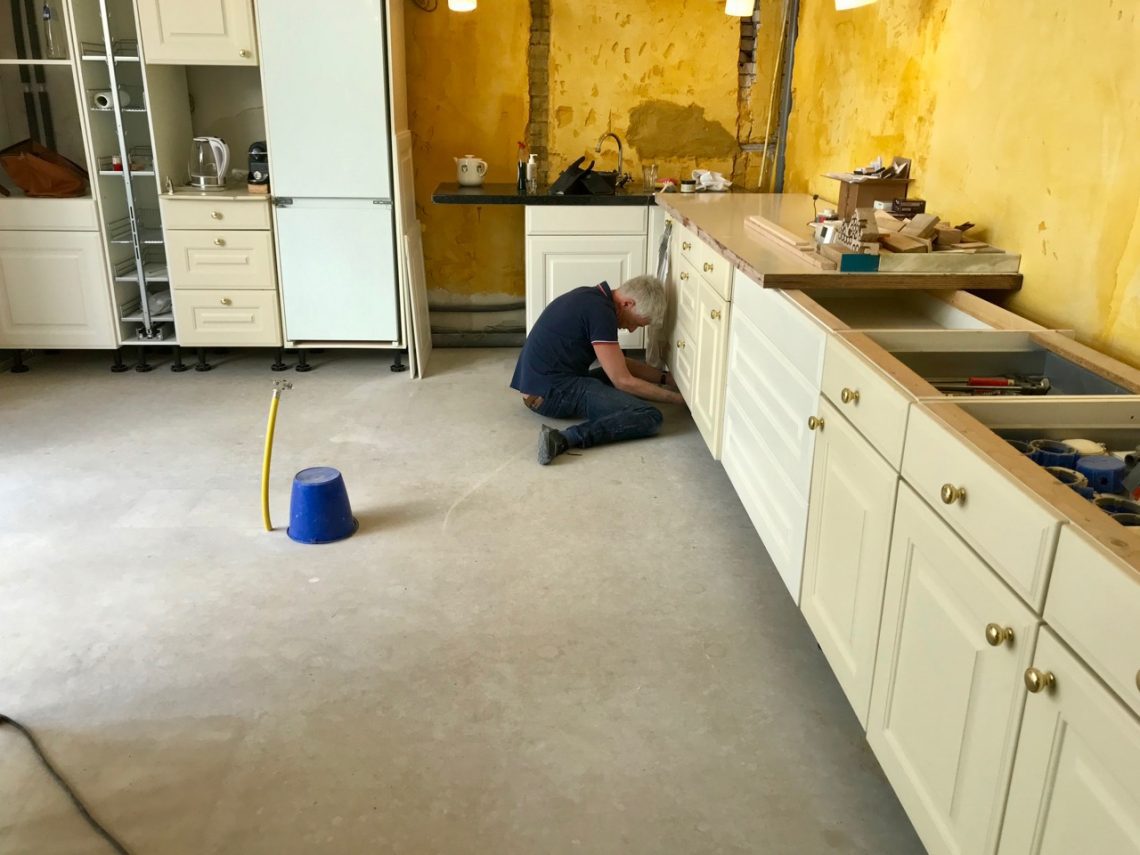 Omdat we toch de tijd voor onszelf hadden bedacht Hessel dat het een goed moment was om de oude deuren die tot nu toe als aanrechtblad gebruikt werden, eindelijk eens op maat zagen. Ze zijn zo massief zwaar, verplaatsen kan alleen maar als je met z’n tweeën bent.