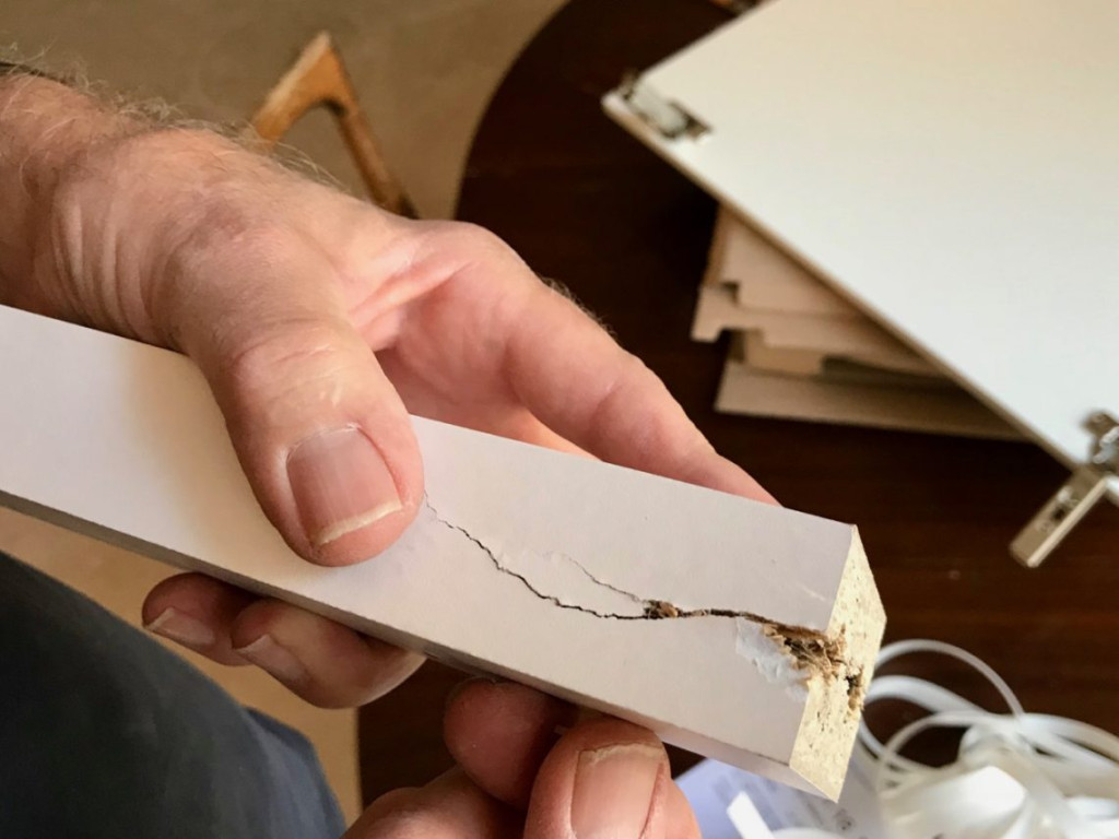 De eerste kast ging heel goed. Dus we deden ook de tweede kast. Hessel zei dat we er klaar voor waren en ik telde af, maar Hessel telde ook af. En ik reageerde alleen op mijn eigen aftelling. Dus toen ik tilde sloeg het deurtje van het kastje open. En spleet het tussenpootje. Of het helemaal 100% mijn schuld was, dat laat ik in het midden. Maar dat het mis was, was duidelijk.