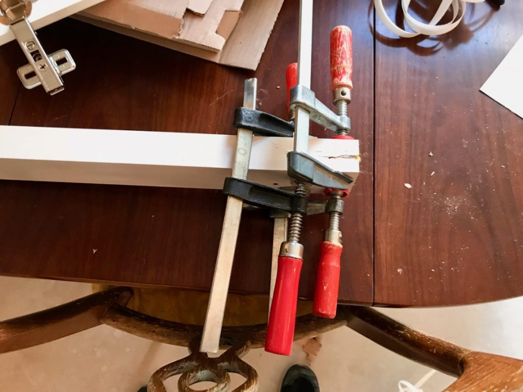 Eerst moest nu het hele kastje uit elkaar gehaald worden, zodat Hessel de poot kon lijmen. In stilte vond ik het eigenlijk ook best idioot dat zo’n kastje een paar honderd euro kost, want het is werkelijk opgetrokken uit spaanplaat en MDF en het gaat allemaal eigenlijk nergens over. Sowieso leek het me beter even de stilte op te zoeken, want Hessel was niet blij. Ik ook niet, maar Hessel was nog meer niet blijer en het wordt dan helemaal zo beklemmend als iemand dat probeert niet te laten merken. Uit liefde. Uhm.
