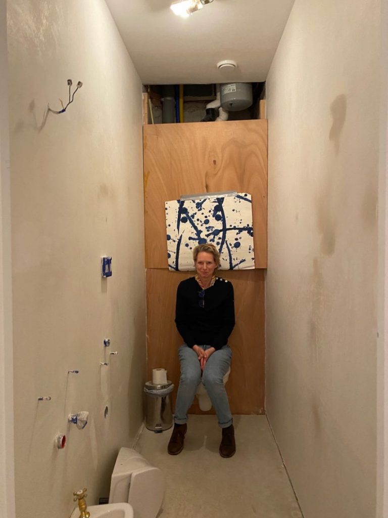 Jeroen vindt het leuk als dit ‘funky’ is en koos een behang met hele grote blauwe spetters. Vond hij ook goed bij het urinoir passen. Er komen geen tegels in de wc, enkel behang.