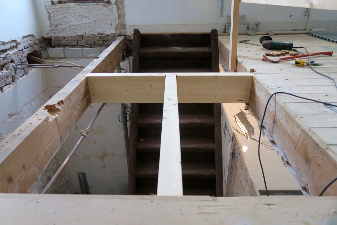 Met behulp van wat oud electradraad, een tuinstoeltje als ondersteuning en een wat geluk, heb ik de balk met zijn gleuf over de koperen gasbuis gestoken, en opgetakeld totdat de andere kant op de raveelbalk kon rusten. Alles paste precies, ik was best een beetje trots op mezelf. Toen de balk in positie lag, heb ik het plankje met constructielijm in de gleuf gelijmd, en de kopse kant van de balk was weer net zo sterk als toen hij nog een boom was.