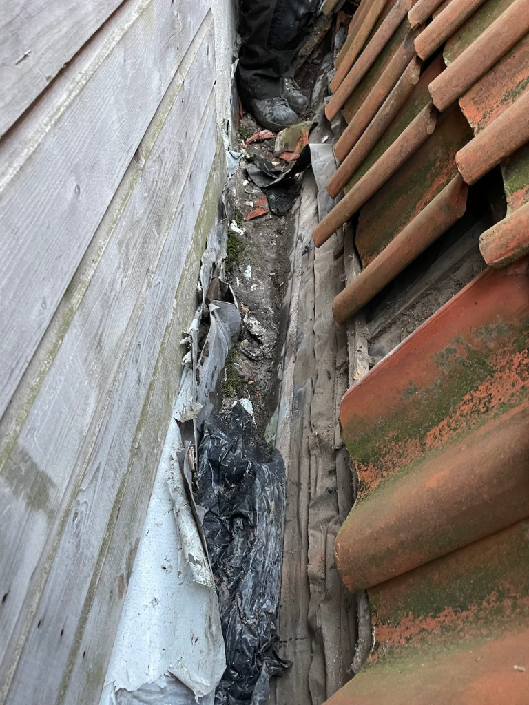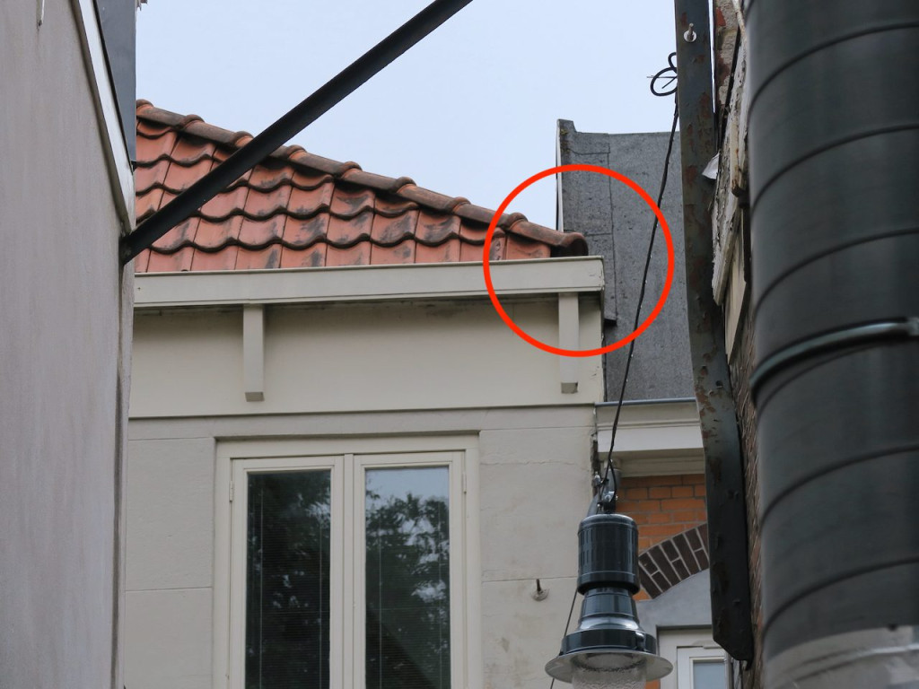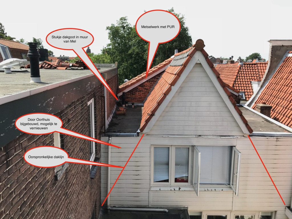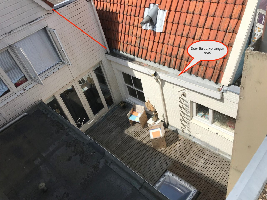 Terwijl dit allemaal speelde regende het ook nogal veel. Buurman Mel van nummer 81 kwam laten weten dat bij hem boven water langs de muur liep. Hessel ging met onze Bart op inspectie uit. Wat bleek: ooit bij het uitbouwen van de bovenverdieping heeft iemand vroeg gedacht “hee het past niet” en in de muur van buurman Mel een gat gezaagd, zodat de dakgoot van 79 rood daar verder ingepropt kon worden. Hou deze gedachte even vast.