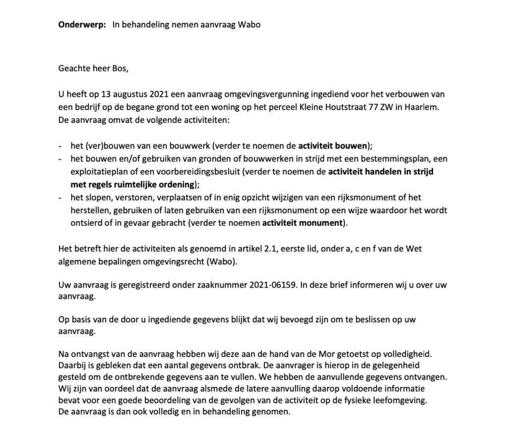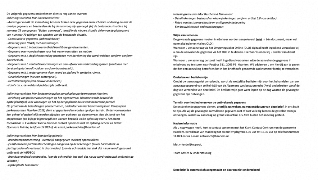 Mocht u de hele vergunningsaanvraag willen lezen, dan kan dat hier. En daar hoort deze rapportage bij over de asbest. Dat is er trouwens niet. Op 1 augustus diende Hessel alles in. Vanaf indienen heeft de gemeente 8 weken de tijd om een beoordeling te geven. Alles leek op rolletjes te verlopen. Totdat er al na een paar weken een brief van de gemeente kwam. Er moest nog aanvullende info worden opgeleverd en wel het volgende: