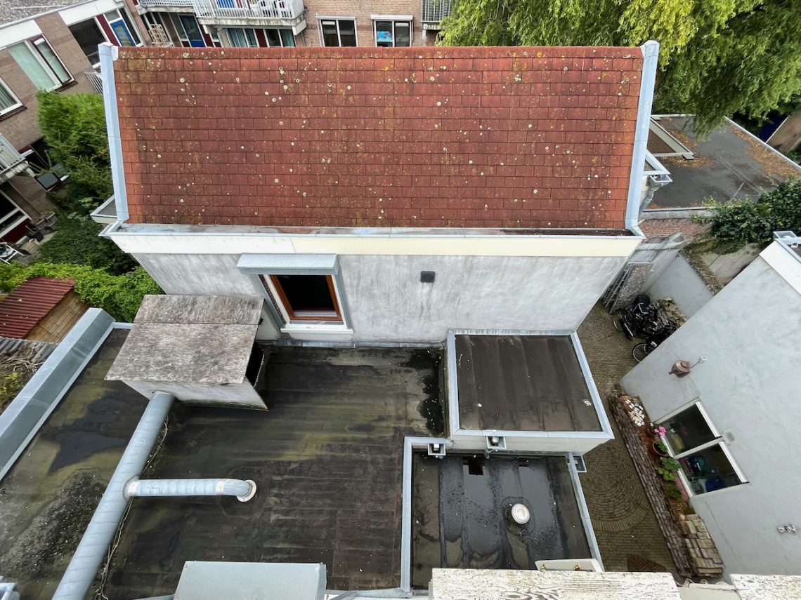 Aan de andere kant, op 77 rood lekte het bij onze hele lieve 85 jarige buurvrouw ook als een gek naar binnen. Ook daar gingen Bart en Hessel eens een kijkje nemen. Wat bleek: de vorige eigenaren zijn echt dol geweest op purschuim….Het hele dak leek wel van purschuim!
