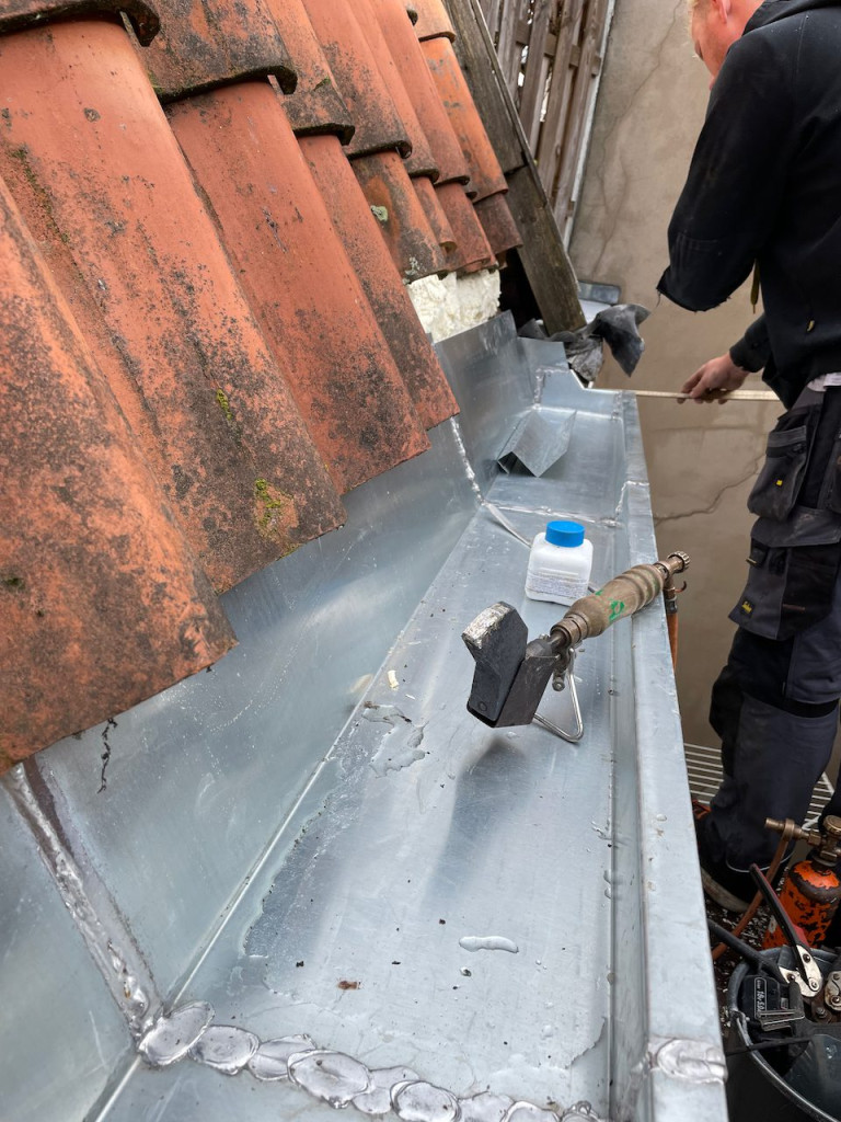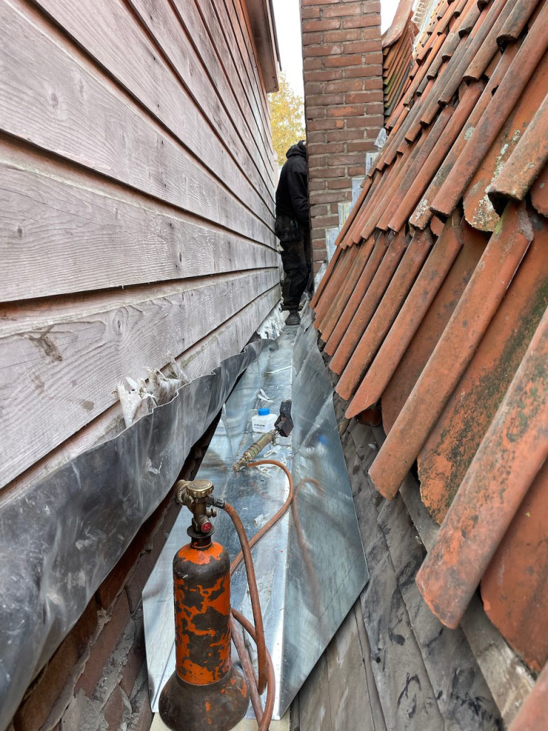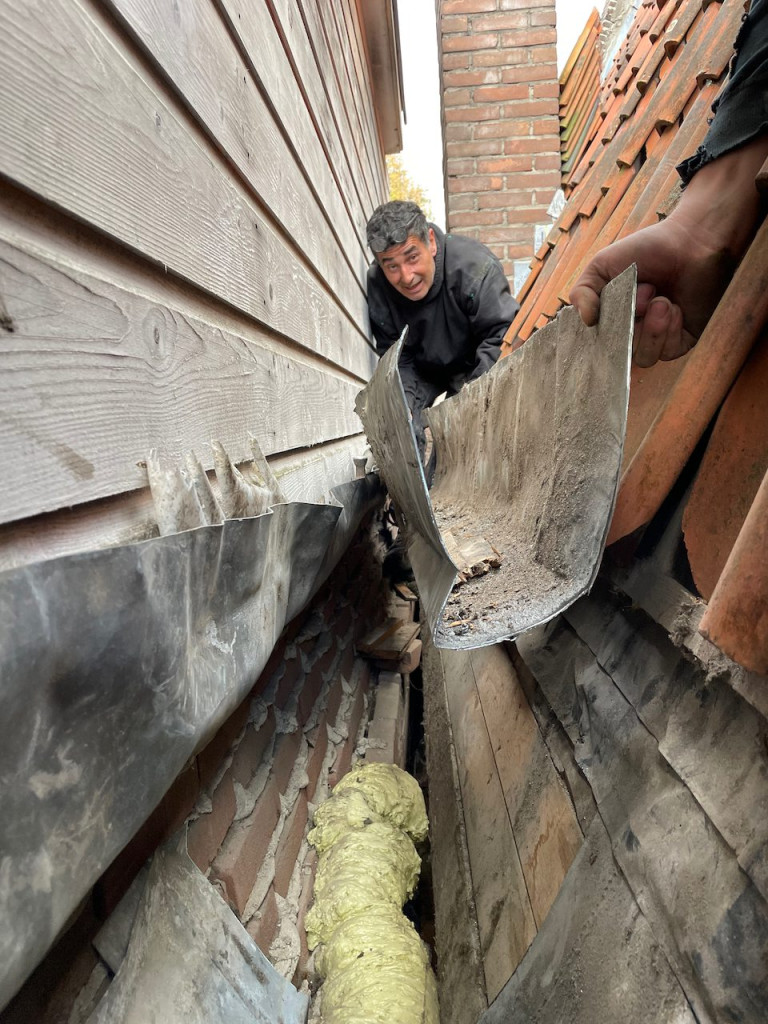 Deze meneer is Paco, die met Bart samenwerkt. Ze hebben met spoed voor ons afgelopen maandag en dinsdag het dak op 77 rood hersteld en er een gloednieuwe dakgoot ingemaakt.