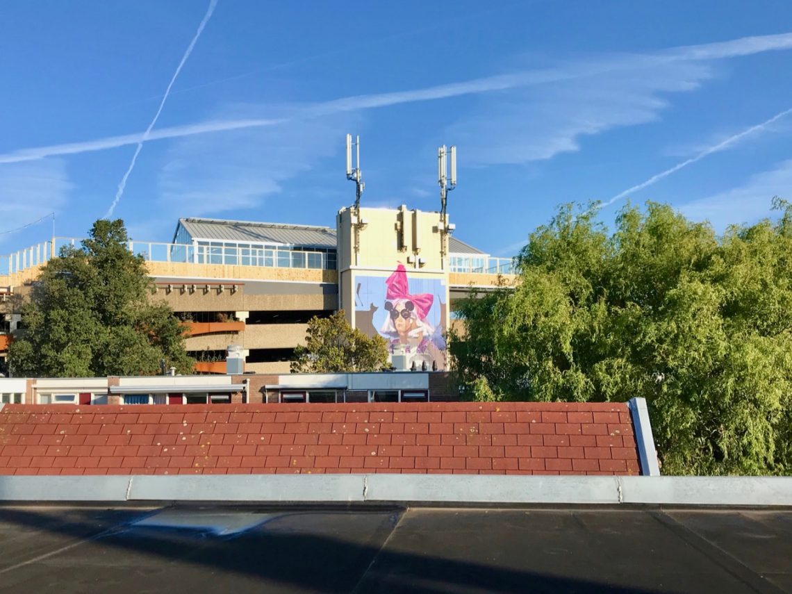Zo kwam ik ook weer eens op ons dak. En wie zag ik over ons waken? Lady Gaga, die dwars door een meisje in het blauw heenbreekt.