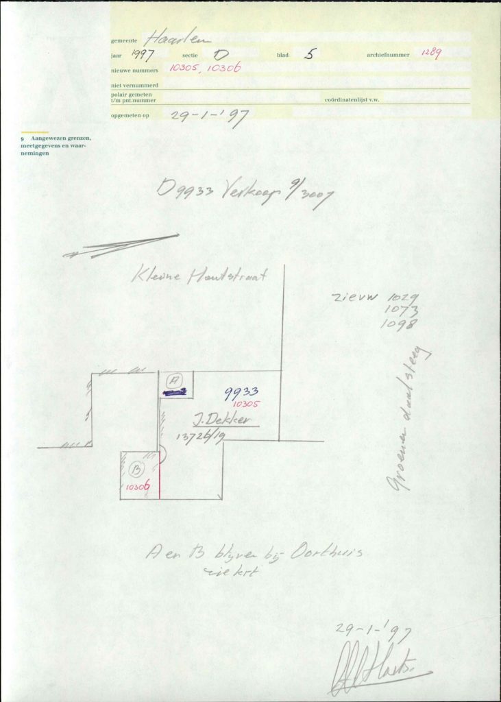 Twintig jaar geleden waren de huisnummers 77, 79 en 81 allemaal van één eigenaar. Hij was de uitbater van het theater op nr 77, en woonde in ons huis op nr 79. De achterkant van het theater vouwt zich een beetje om ons huis heen. Rond 1997 heeft de eigenaar besloten om nr 77 te verkopen. Hij verkocht de voorste helft van het theater aan de huidige eigenaar, en het stuk rondom ons achterhuis aan een andere koper. Maar hij verkocht niet het hele achterste gedeelte, nee, hij heeft dat gedeelte notarieel laten spitsen. 90 procent van het terrein deed hij in de verkoop, en een klein afgesplitst stukje hield hij zelf. Dat stukje kreeg toen een eigen kadastraal nummer. Op de Kadastrale kaart van die splitsing staat ook duidelijk aangegeven dat dat stukje bij hem bleef behoren, bij nummer 79 dus.