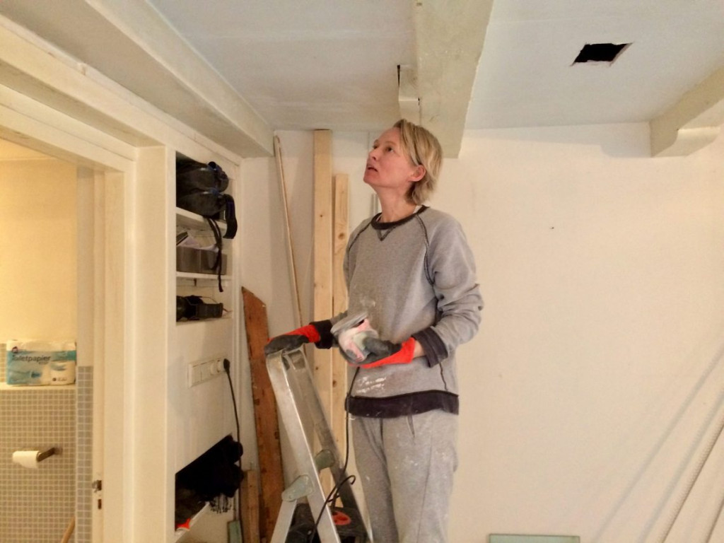 Hessel deed ondertussen boven halsbrekende toeren, hoog in de nok. Ik heb niet gekeken hoe, maar toen het klaar was zag het er wel geweldig uit. De bovenkamertjes zijn helemaal klaar qua latex. Vandaag (zaterdag) starten we mogelijk met houtverf.