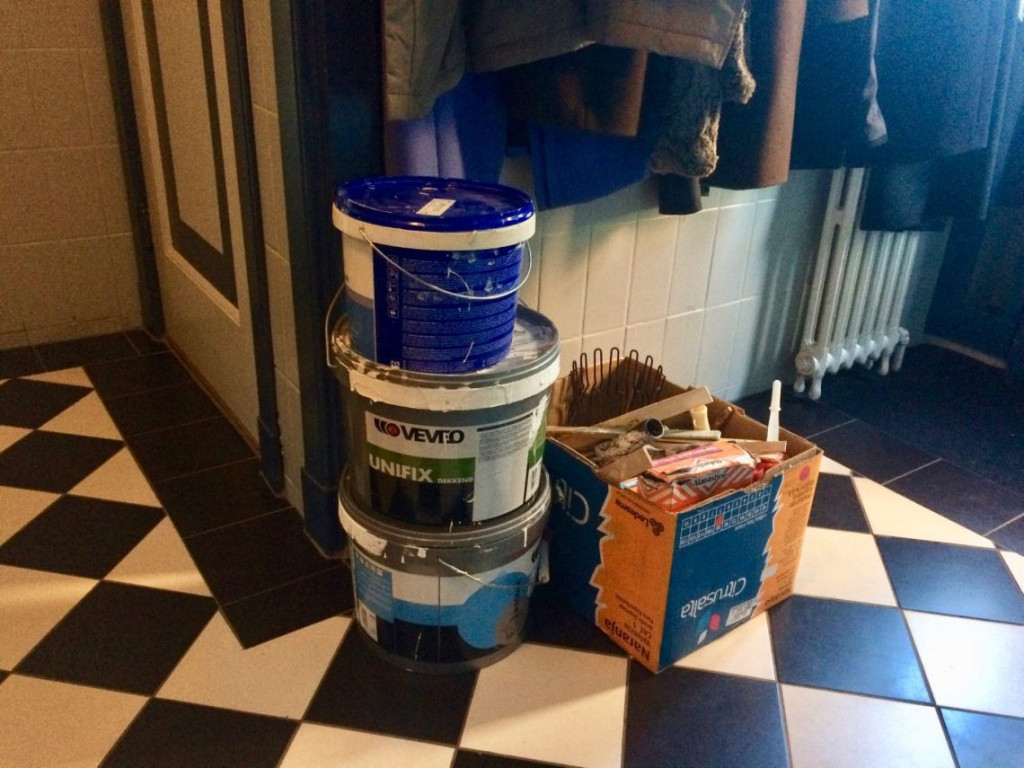 Alles wat we mee wilden nemen zetten we klaar in de hall. Toch maar mooi een aantal grote emmers witte muurverf en wat kleingoed. Superlekker dus!