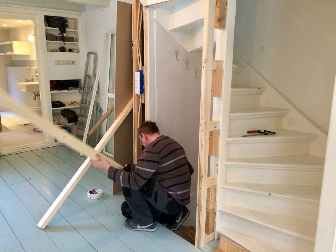 Eigenlijk is er niks aan de hand hoor. De Polen zouden met twee man sterk nog een dagje komen helpen. Mariusz is van beroep timmerman, die ging lekker aan het werk. Als eerste timmerde hij een nieuw frame voor de deur boven aan de trap.