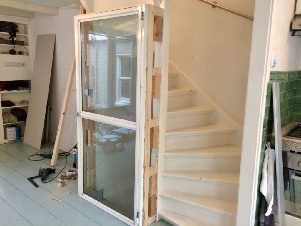 Nou ja, zo’n dag dus. Ik had gehoopt dat er meer gebeurd zou zijn, zodat ik alleen nog maar zou moeten schilderen. Nu ga ik vandaag eerst de muurtjes rondom de nieuwe deur met gipsplaat afwerken, stucen, een blad monteren op het kastje in het wasmachinehokje en kijken of ik het Ikea deurtje een beetje netjes op de vaatwasmachine krijg.