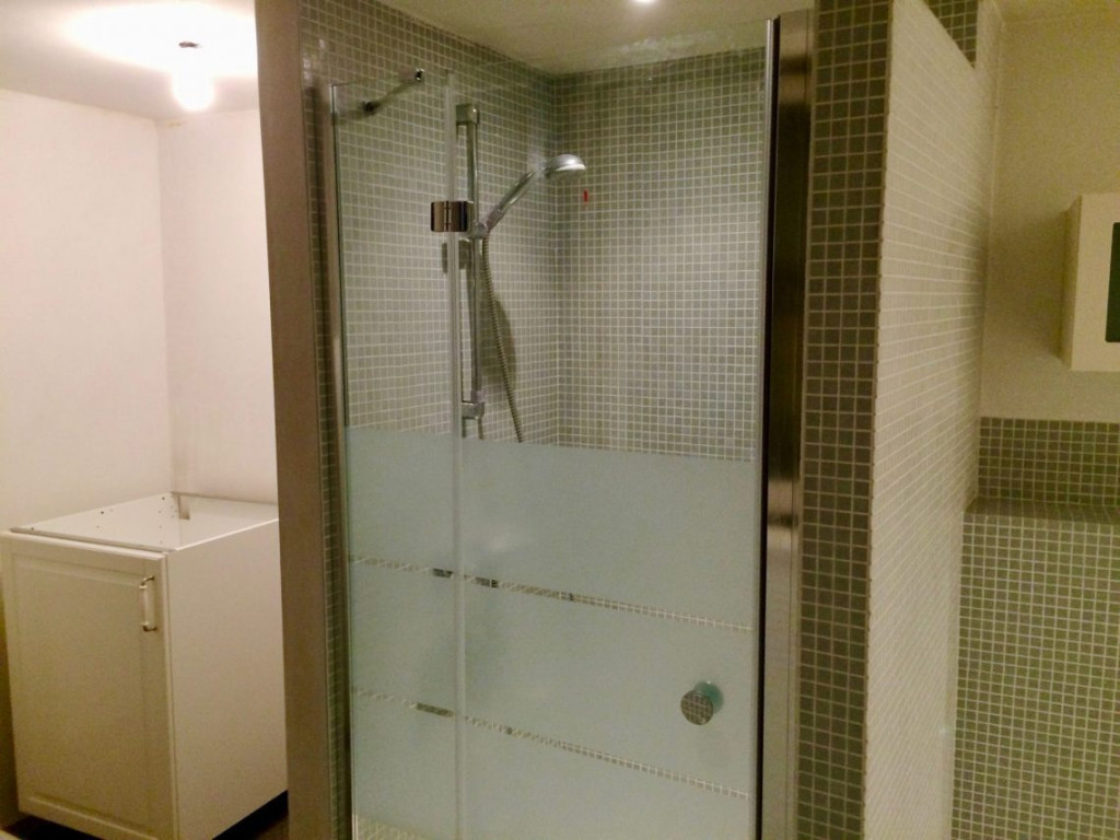 Tot zover ging het lekker. Het liep al tegen lunchtijd. Maar wat was die Zbisjek toch aan het doen? Hij was al paar uur beneden en in de badkamer bezig. Ik had hem gevraagd om met wat oude tegeltjes een stukje in de douche aan te helen. Beneden stond nog een gesloopte plaat met dat soort tegels. Hij bleek al die tijd bezig geweest te zijn met het losslijpen van de tegels, en het inlijmen in de douche.